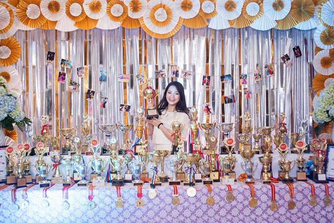 | Kiện tướng 16 tuổi khoe gia tài thành tích "khủng" của mình với hơn 100 huy chương và hơn 50 cúp lưu niệm. Ảnh: Quỳnh Hương. |