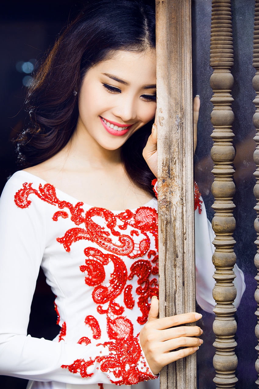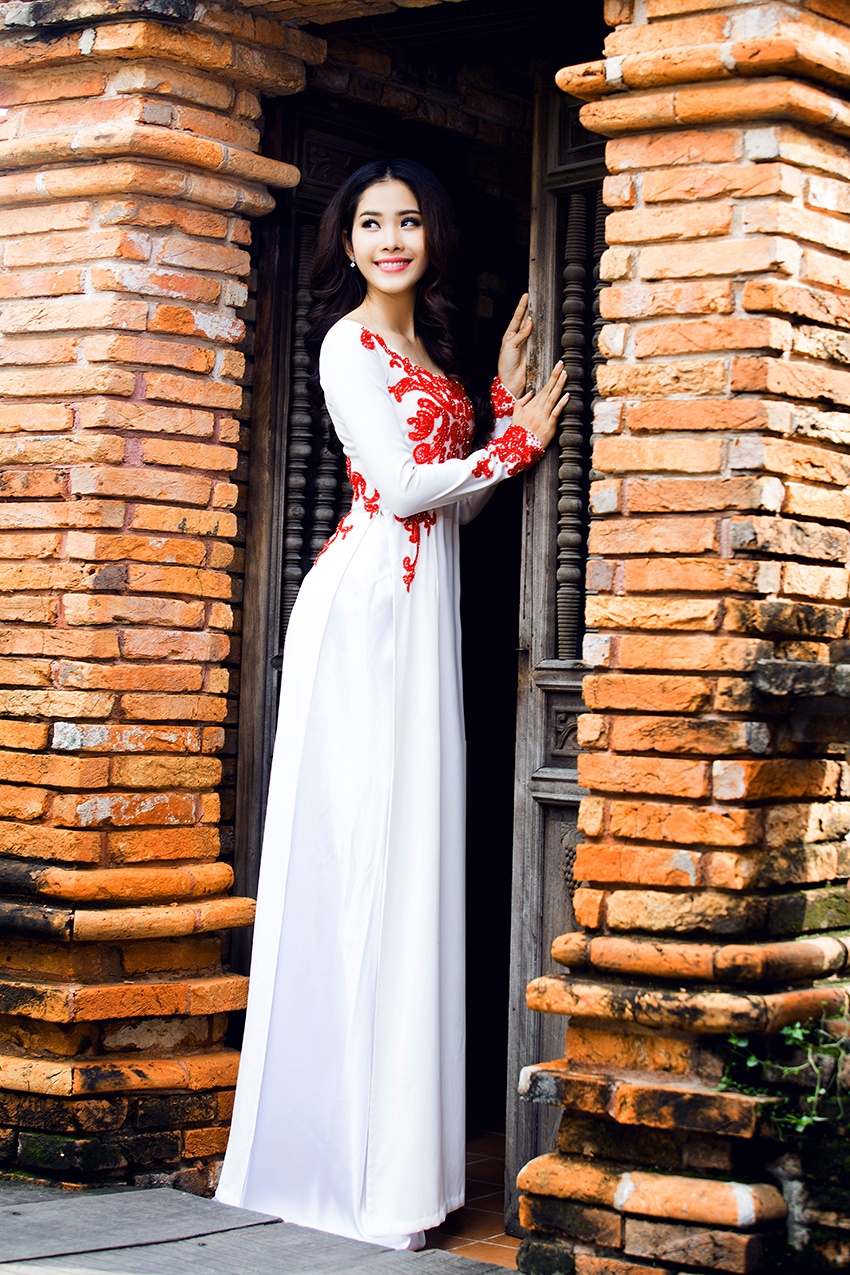 | Áo dài trắng điểm họa tiết ren ở thân áo tôn gương mặt thanh tú của người đẹp cao 1,71 m. |