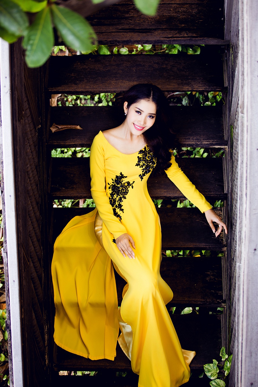 | Trong bộ ảnh mới, Hoa khôi Đồng bằng sông Cửu Long thể hiện ba mẫu áo dài cách tân, lược cổ của nhà thiết kế Minh Châu. |