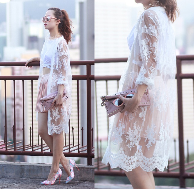 | Áo khoác ren kết hợp sheer trong suốt mang đến nét mới lạ, ấn tượng cho set đồ crop – top kiểu dáng quen thuộc của Camillie Co. |