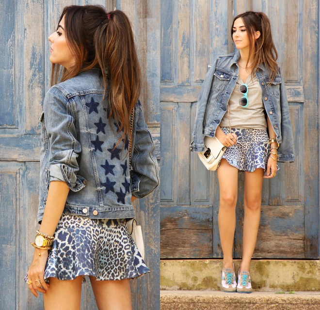 | Flavia Linden thu hút hàng nghìn lượt “like” khi phối áo khoác denim họa tiết sao sành điệu với váy denim da báo nữ tính. |