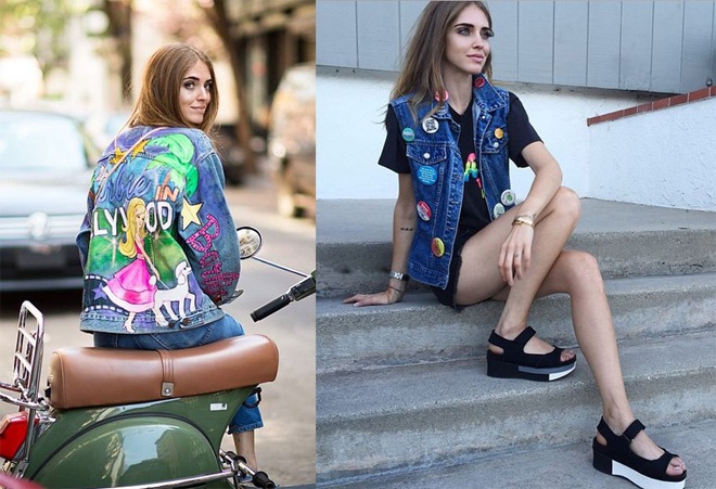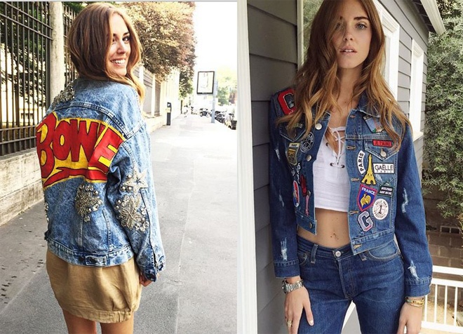 | Chiara Ferragni chứng tỏ luôn là fashion icon dẫn đầu nhiều xu hướng street style mới. Chẳng hạn như mốt áo khoác denim trang trí các icon ngộ nghĩnh, bắt mắt. |