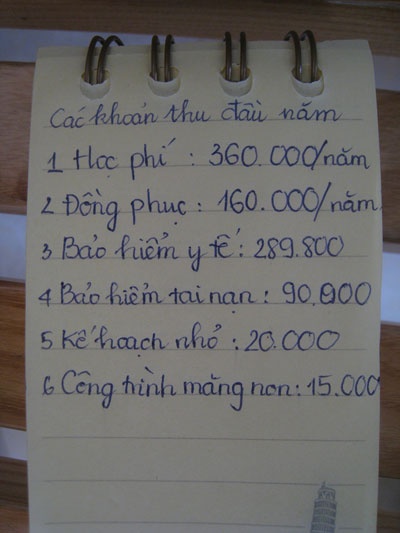 Chị Thủy - một bà mẹ đơn thân có con gái mới vào lớp 10 tại một trường THPT ở huyện Giá Rai, tỉnh Bạc Liêu - cho biết chị cũng đang đau đầu vì khoản thu đầu năm hơn 1,5 triệu đồng. “Tôi làm giáo viên mầm non cho một trường tư thục được trả lương chỉ khoảng 2 triệu đồng/tháng mà tiền thu đầu năm của con đã chiếm quá nửa” - chị Thủy chua chát.