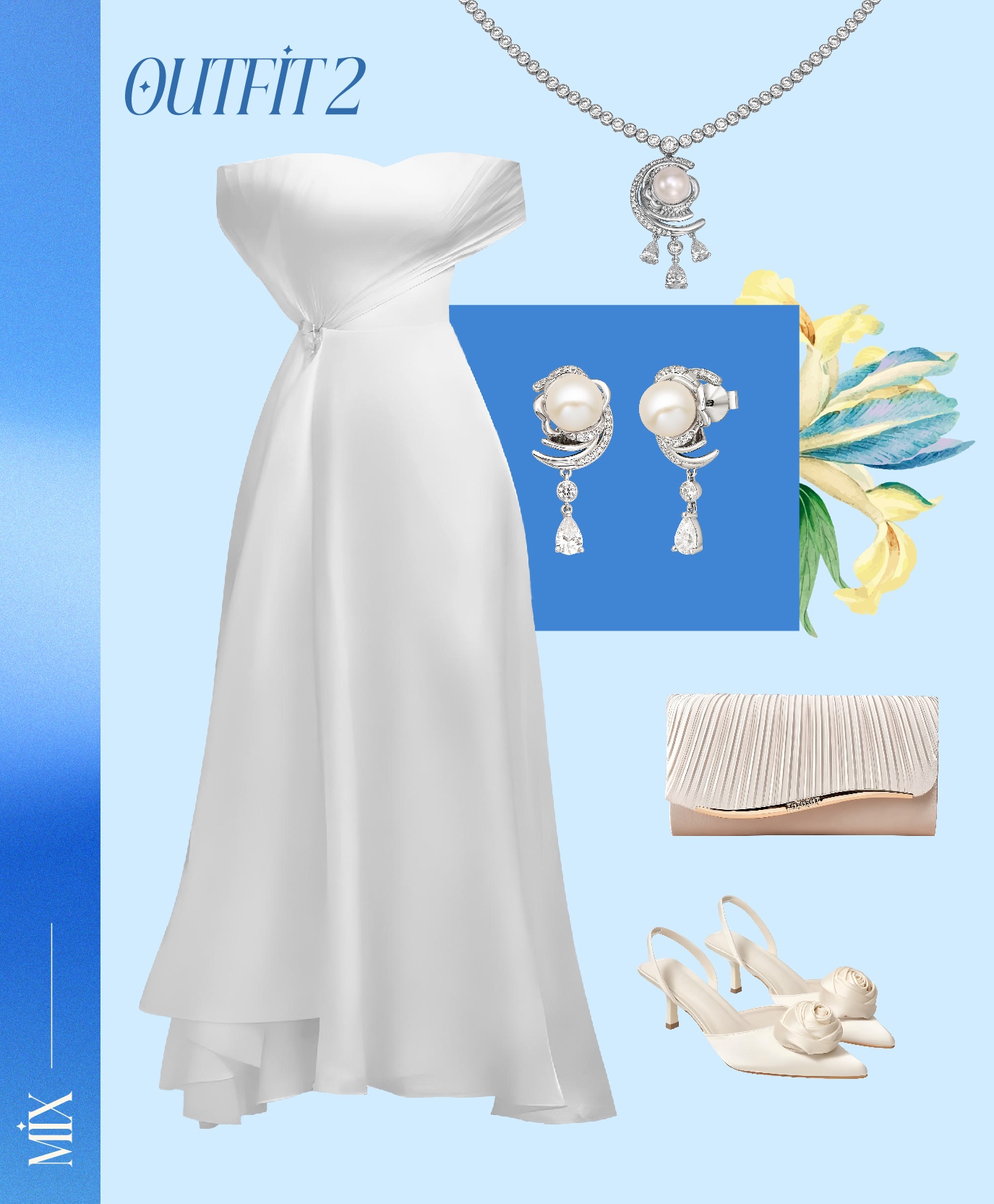 Mẫu váy lụa trắng được gợi ý toát lên vẻ đẹp trang nhã và nữ tính với thân trên cúp ngực khéo léo khoe vùng xương quai xanh, thân váy dài cách điệu ở phần đuôi để mỗi bước di chuyển của nàng trong bữa tiệc đều uyển chuyển như đóa hoa rung rinh trong gió. Chi tiết voan off-shoulder nhẹ nhàng che các khuyết điểm của bắp tay và giúp tổng thể trang phục thêm phần thanh lịch.