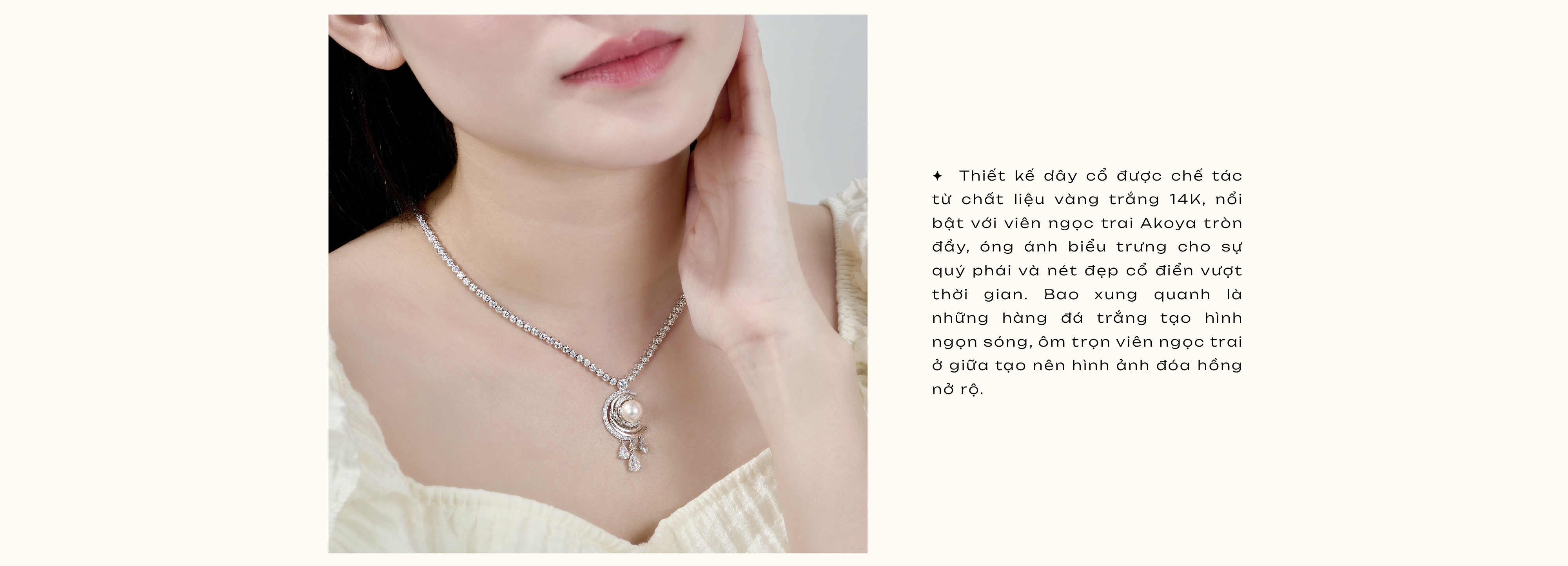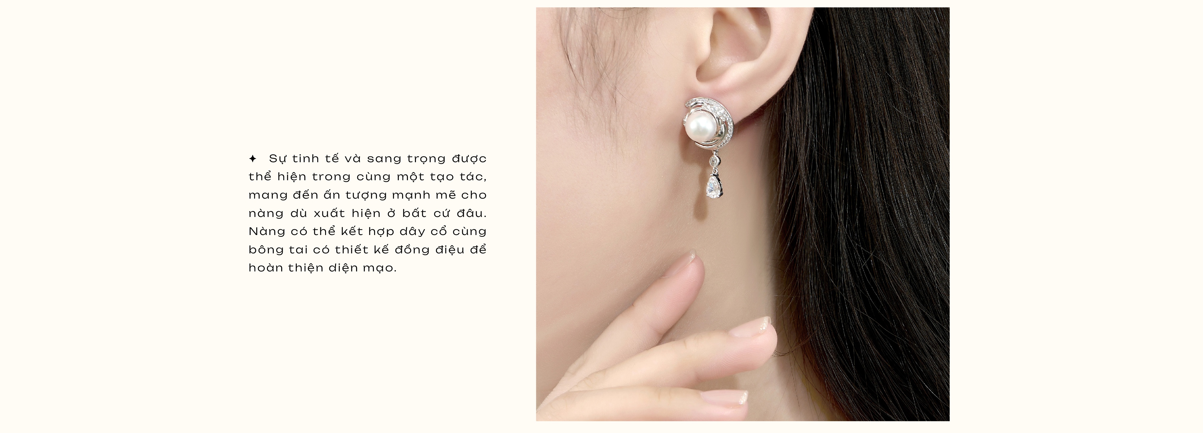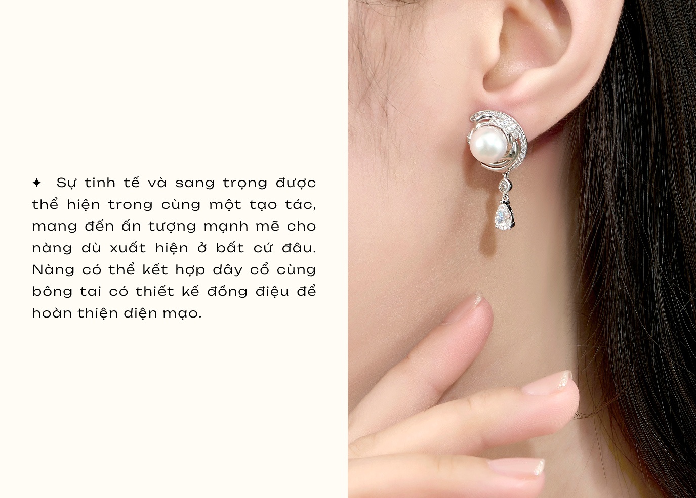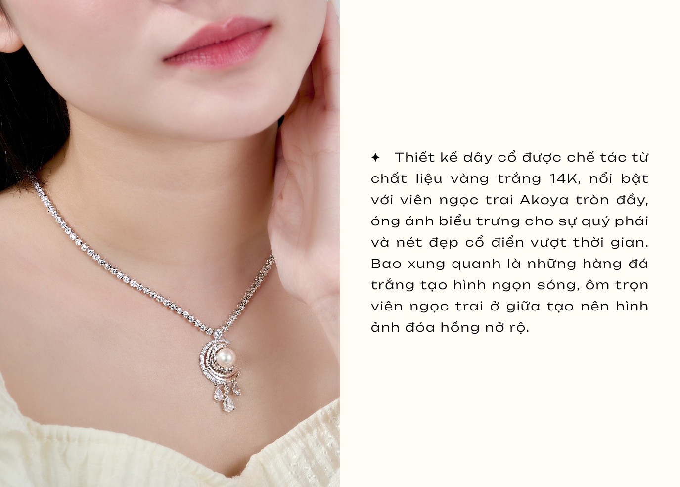 Để phối hợp cùng phong cách quý cô thanh lịch, nàng có thể ưu tiên cho các món trang sức ngọc trai từ BST Audax Rosa của PNJ. Ngọc trai là biểu tượng của sự tinh khiết và thanh cao, mang lại vẻ đẹp sang trọng và cổ điển, thường được yêu thích bởi sự thanh nhã và quý phái mà nó mang lại.
