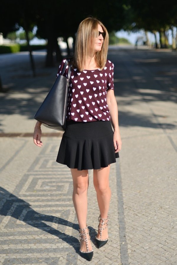 | Với những ngày ấm áp, có thể sử dụng mẫu áo thun mang họa tiết trái tim kết hợp váy xòe trẻ trung. |
