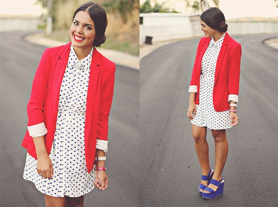 | Cách kết hợp váy xòe với blazer đỏ rực với điểm nhấn là họa tiết trái tim giúp bạn thêm rạng rỡ. |