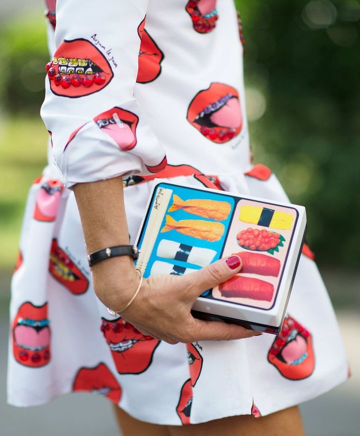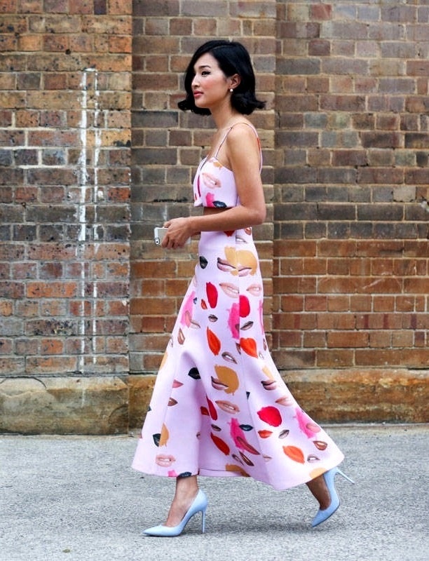 | Họa tiết đôi môi xuất hiện trên váy xòe giúp mẫu váy trở nên bớt nhàm chán. |