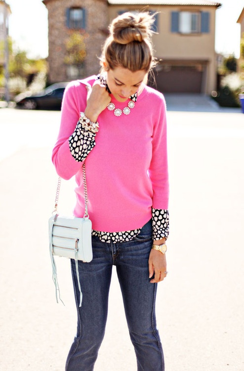 | Những mẫu sơ mi họa tiết trái tim kết hợp với áo len hồng giúp bạn gái tự tin xuống phố. |