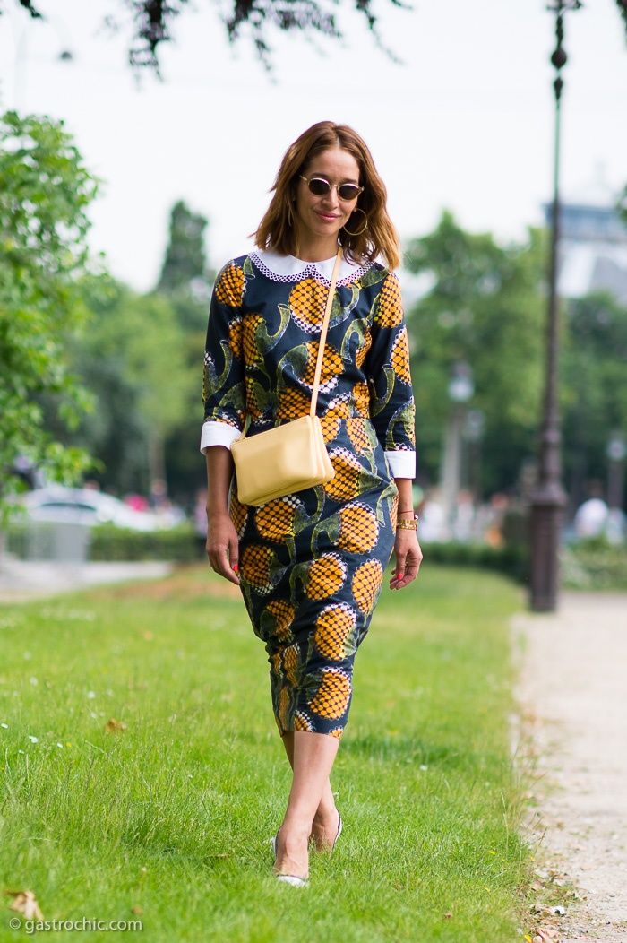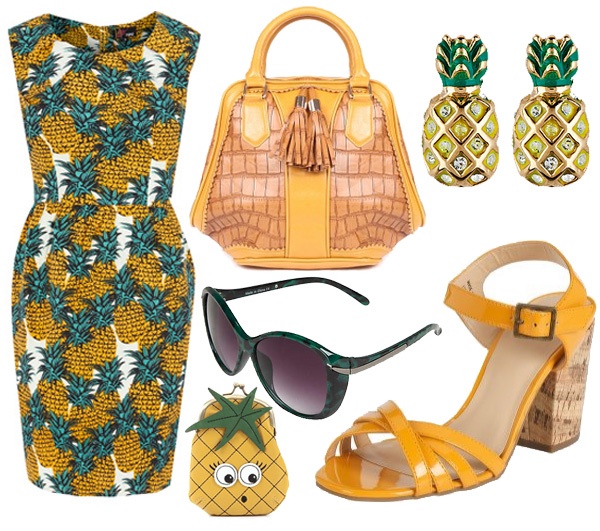 | Phong cách đậm màu nắng với túi xách vàng rực rỡ và bộ đầm in những hình trái dứa sắc màu. |