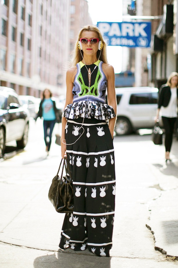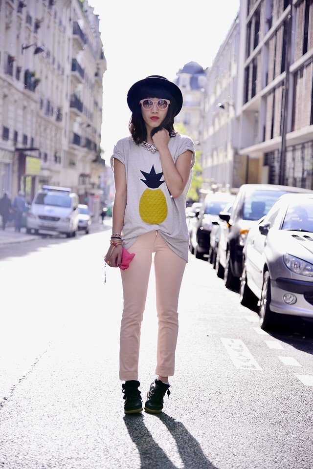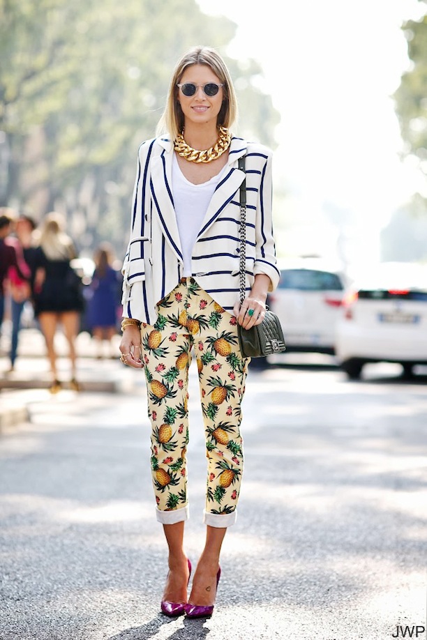 | Trái dứa giúp tô đậm phong cách cho miền nhiệt đới khi mix kèm blazer và giày mũi nhọn. |