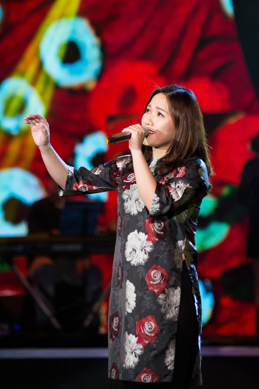 | Thùy Chi đằm thắm và nữ tính hơn trên sân khấu. Nữ ca sĩ khoe chất giọng trong trẻo, cao vút trong bài hát Bé tí teo của tác giả Nguyễn Nhật Trung. |