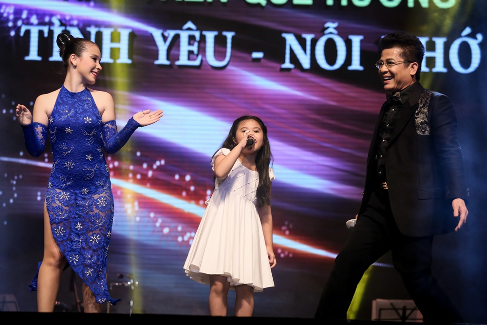 | Quang Lê và con gái nuôi Phương Mỹ Chi mở màn chương trình bằng liên khúc Hành trình trên đất phù sa – Về quê ngoại. Tiết mục nồng nàn, duyên quê khi tái hiện miền Tây sông nước sống động trên sân khấu. Chiếc nón lá cách điệu giúp ngôi sao nhí chuyên hát dân ca thêm phần duyên dáng. |