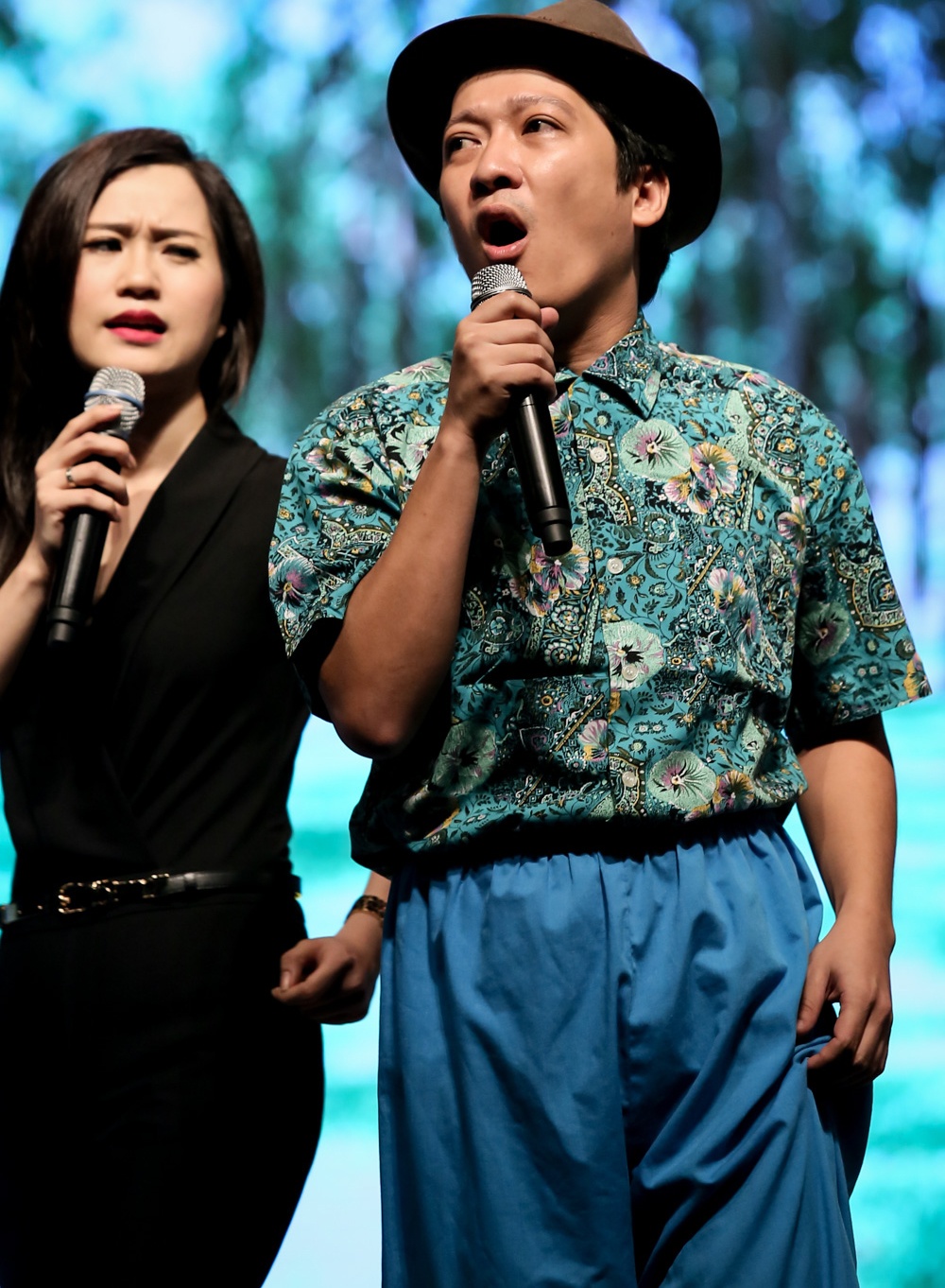 | Diễn viên hài Trường Giang và bạn diễn tung hứng trong tiểu phẩm Trai anh hùng gặp gái thuyền quyên. Tiểu phẩm còn có sự tham gia của Phương Mỹ Chi. |