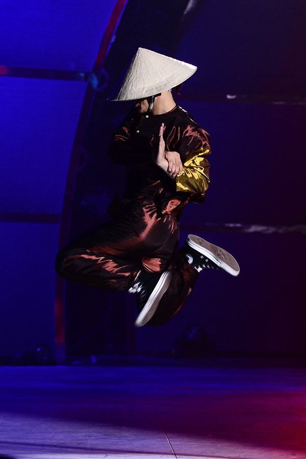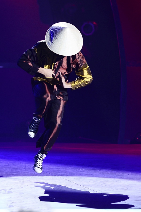 Đình Hải vẫn sử dụng hiphop làm chất liệu biểu diễn nhưng sáng tạo với trang phục nón lá, áo vải nâu đậm chất Việt Nam trên nền nhạc Lifestyle. |