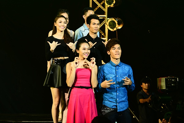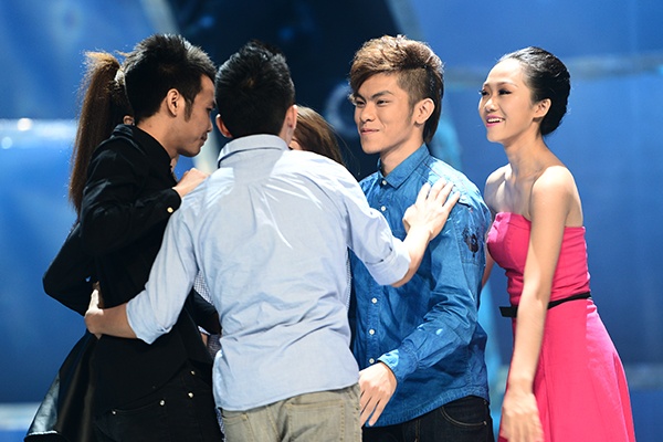 Thế Chung vừa dứt lời, các vũ công ở dưới đã lao đến ôm chầm lấy cả 2. Minh Tú khóc nức nở, không rời Thùy Vân khiến Đình Hải phải dìu đi. |