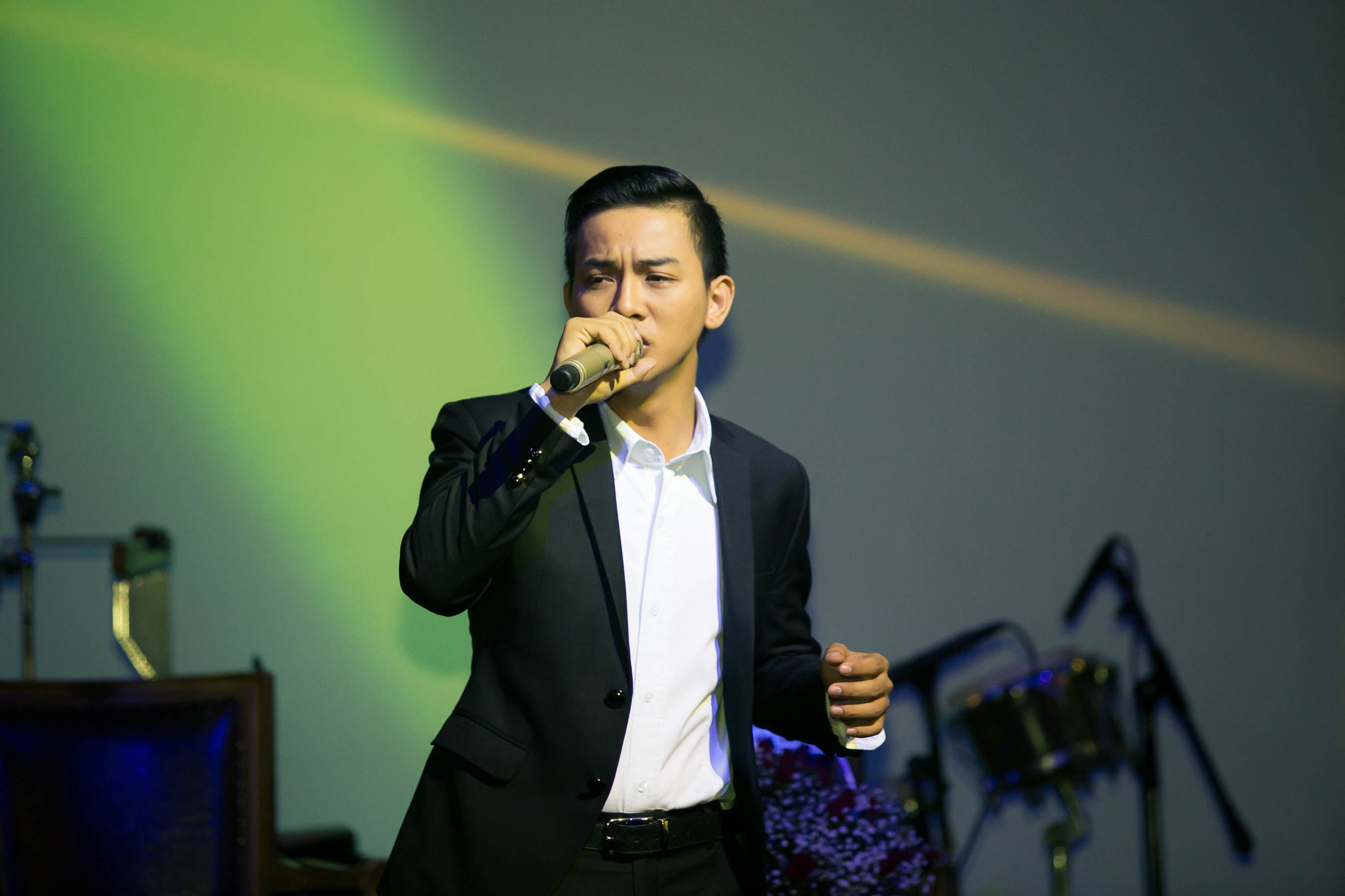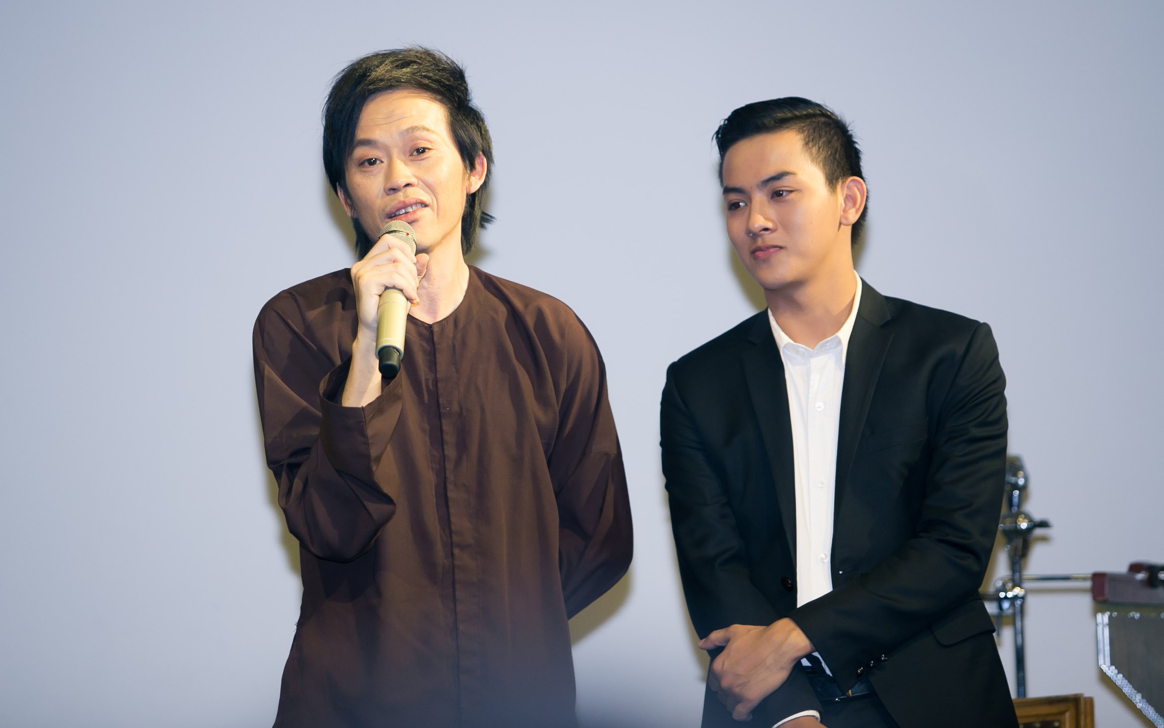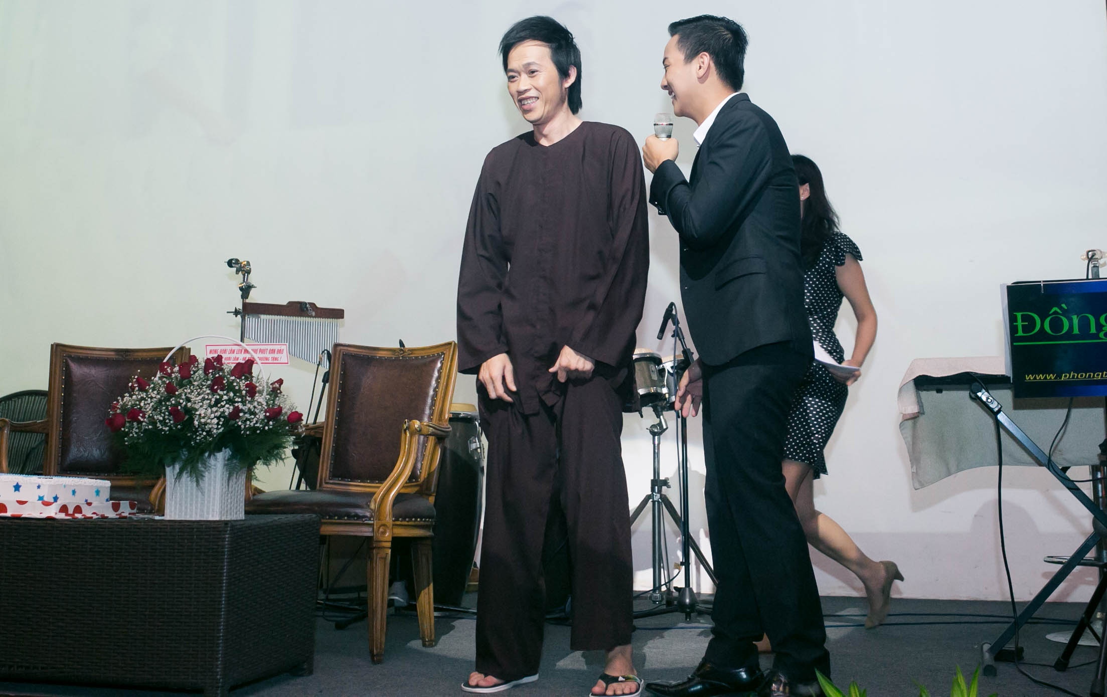 | Trong lúc họp báo diễn ra, Hoài Linh bất ngờ xuất hiện trong tiếng reo hò của khán giả. Danh hài diện trang phục khá đơn giản với áo bà ba, chân xỏ dép lào đến chúc mừng con trai nuôi. |