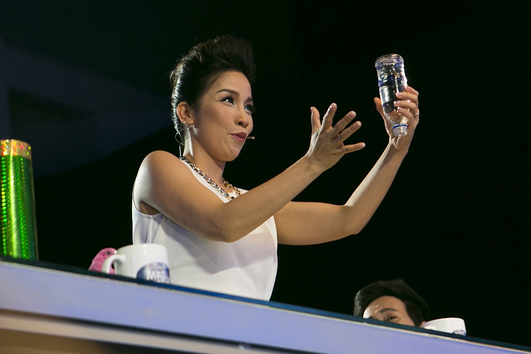 | Chai nước dù bị chổng ngược nhưng hoàn toàn không chảy nước khiến khán giả vô cùng thích thú và liên tục vỗ tay khen ngợi Mỹ Linh. |