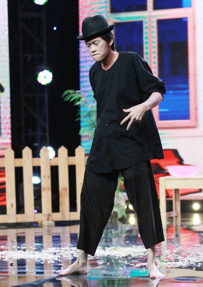 | Hình ảnh thực khách bí ẩn diện trang phục áo bà ba, đi chân đất nhảy hip hop và đọc rap trên nền nhạc Chim trắng mồ côi khiến người xem không thể nhịn cười. Sau khi hạ gục chủ quán Tiếu lâm, nghệ sĩ nói: "Con tôi là rapper, tôi là cha nó, tất nhiên phải giỏi hơn nó". |