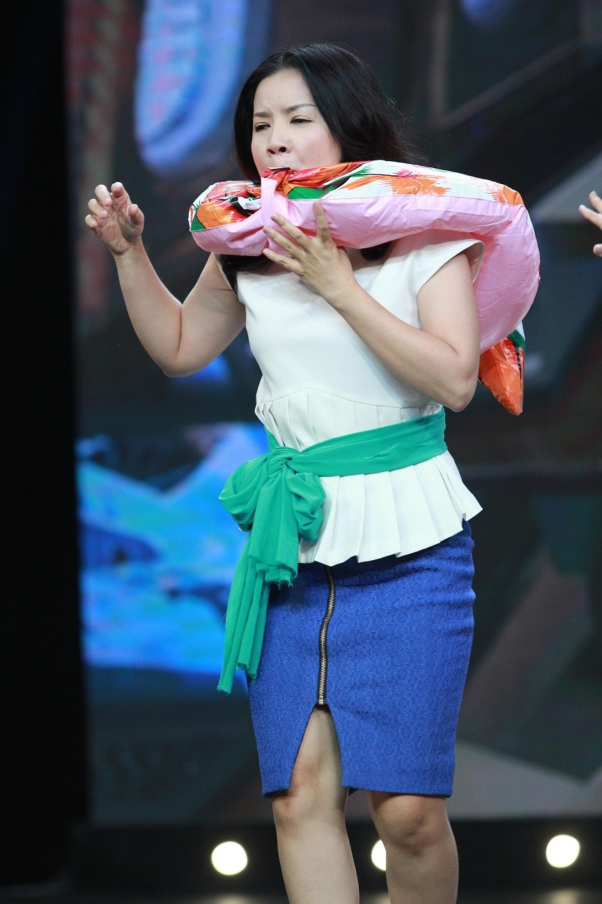 Alibaba Gia Bảo gây cười khi vén áo khoe thân hình mập mạp. Diễn viên hài cho biết: “Hội quán tiếu lâm là chương trình hài ấn tượng, vì khách mời không hề biết trước kịch bản và bị hành quá trời quá đất, nhưng Gia Bảo rất vui vì khán giả trường quay ủng hộ nhiệt tình”.