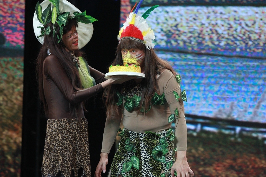 Theo đó, các thành viên gia đình hội quán buộc phải ăn bánh kem không dùng tay. Với sự "trợ giúp" nhiệt tình của Hoài Linh, gương mặt ông chủ Chí Tài lấm lem bánh.