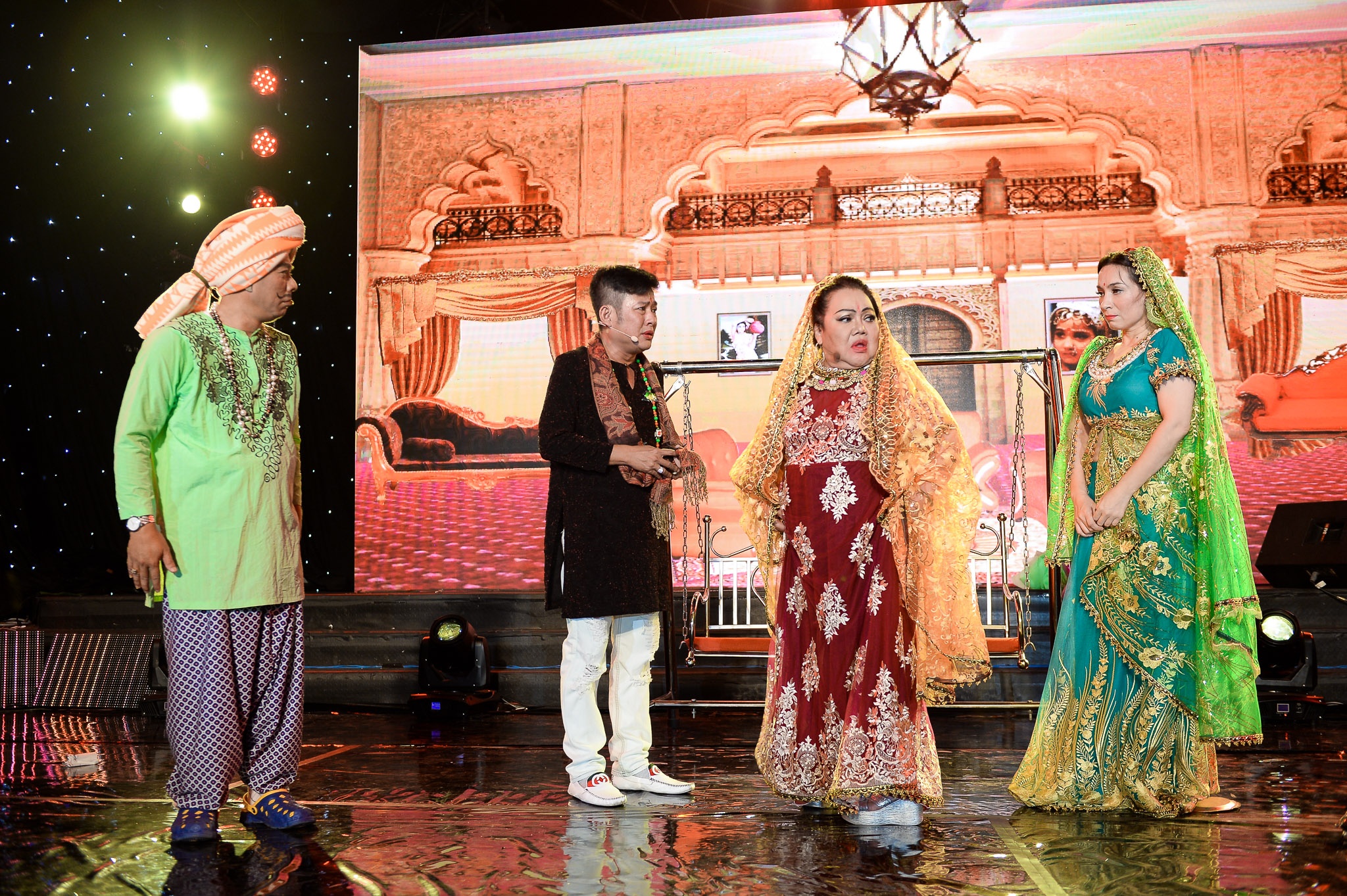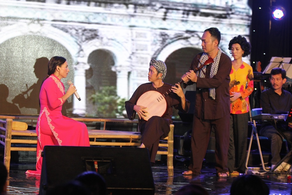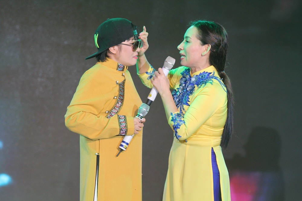| Trên sân khấu, Phi Nhung và nam danh hài thể hiện nhạc cảnh Dạ cổ hoài lang. Giọng hát da diết của nữ ca sĩ mang đến nhiều cung bậc cảm xúc. Hoài Linh mặc áo bà ba, đội khăn rằn quen thuộc, phối hợp ăn ý cùng đồng nghiệp. Bối cảnh sân khấu được dàn dựng đặc trưng Nam bộ. |