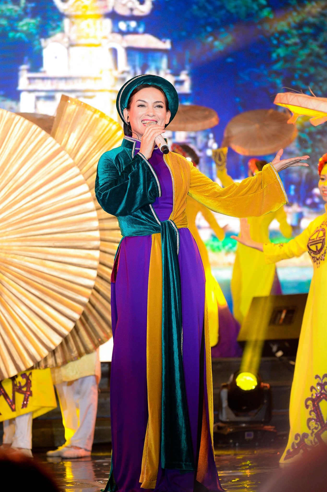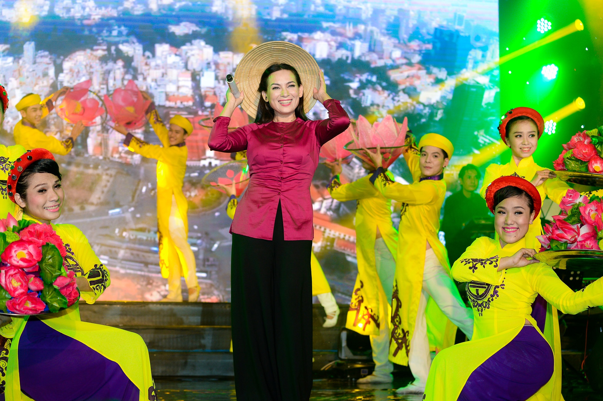 Trước đó, chương trình được mở màn bằng các ca khúc thể hiện tình yêu quê hương đất nước. Nữ ca sĩ 43 tuổi diện trang phục truyền thống đặc trưng của hai miền Nam Bắc biểu diễn các ca khúc Quê hương ba miền, Duyên quê. Trong ảnh, giọng ca Làm dâu xứ lạ duyên dáng trong bộ áo tứ thân đặc trưng vùng Bắc bộ.