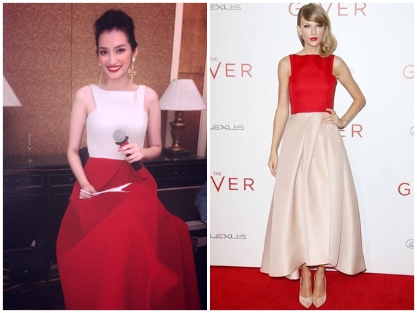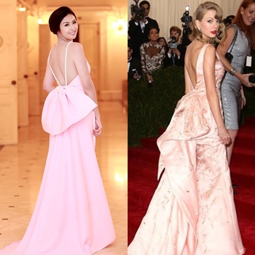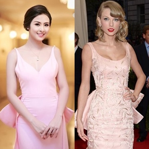 | Nhờ thiết kế váy dạ hội màu pastel hợp dáng, hoa hậu Ngọc Hân lọt nhóm sao đẹp của nhiều bình chọn. Tuy nhiên, thiết kế dạ hội mới mẻ lại bị phát hiện có nhiều điểm giống với mẫu thiết kế với Taylor Swift. |