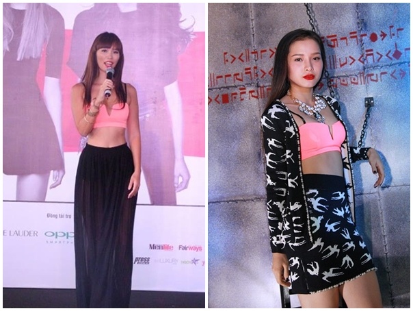 | Tớ dự một buổi công chiếu phim, Ca sĩ Phương Trinh vô tình mặc lại thiết kế bra-top gợi cảm mà siêu mẫu Hà Anh từng sở hữu trước đó không lâu. Với thân hình nóng bỏng, Hà Anh được cho là nổi bật hơn hẳn cựu thành viên nhóm nhạc Amigo G. Thậm chí, Phương Trinh có phần lép vế khi mix trang phục không thống nhất về phong cách. |