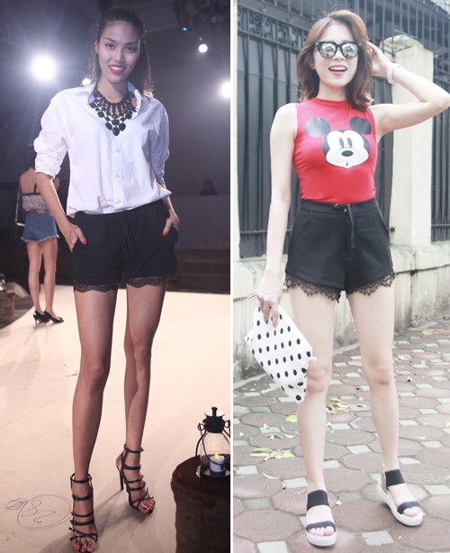 Người mẫu Lan Khuê diện một thiết kế quần short ren đụng hàng với hot girl Linh Rin. Đây là kiểu quần đang được nhiều tín đồ thời trang yêu thích.