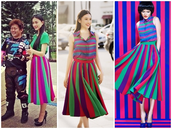 | Trang phục sọc kẻ của Đỗ Mạnh Cường cũng là chọn lựa được nhiều người đẹp Việt ưa chuộng. Người mẫu Tường Vy, diễn viên Ngô Thanh Vân và Tuyết Lan cùng diện một mẫu váy mindi sọc dọc phá cách và hiện đại. |