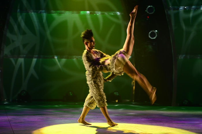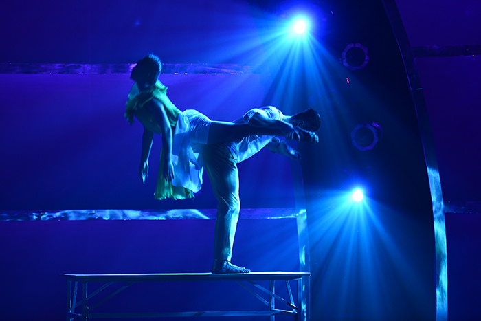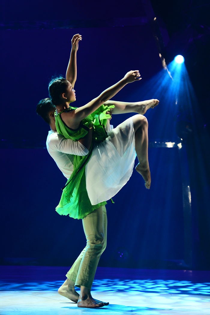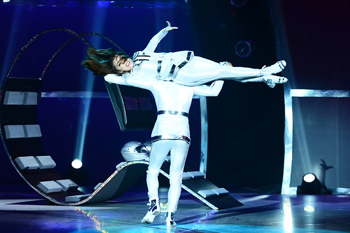 Trên nền nhạc Dangerous, Ngọc Anh - Ngọc Tuấn đưa khán giả vào không gian của họ bằng những tạo hình tuyệt đẹp. Ngọc Anh xoay vòng trên không trung và lặp lại động tác này hơn một lần. Xuất thân từ bộ môn thể dục dụng cụ nên cô gái trẻ biết cách giữ thăng bằng cho vóc dáng. |
