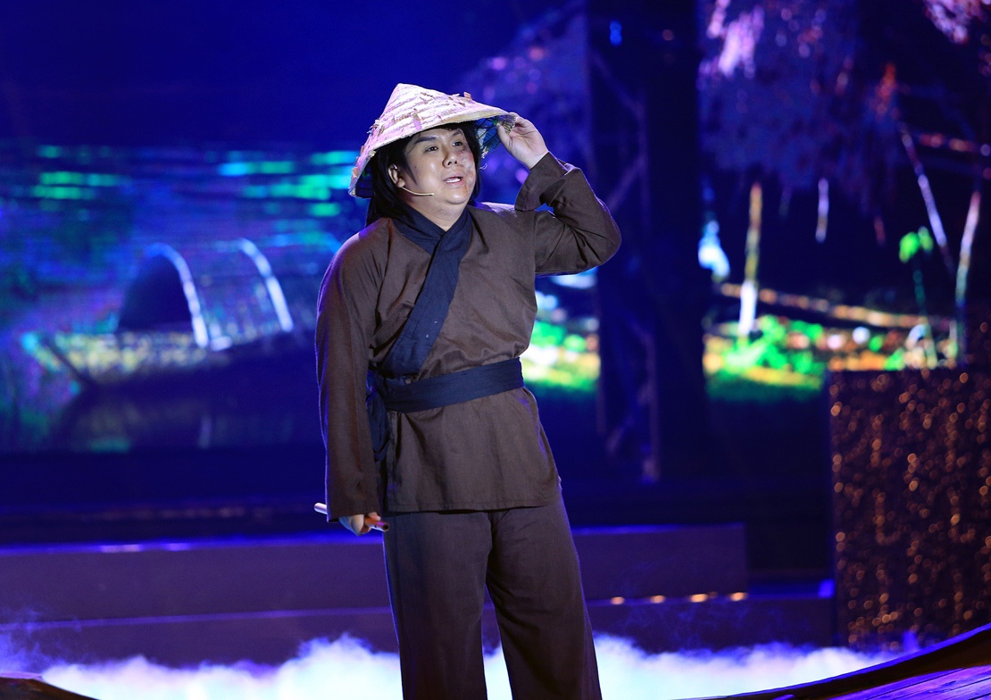 | Trình diễn tiết mục Trương Chi - Mỵ Nương, Gia Bảo tập trung vào giọng hát, diễn xuất để thể hiện trọn vẹn phần cảm xúc nội tâm của nhân vật, khâu hóa trang cũng được anh đầu tư kỹ càng. |