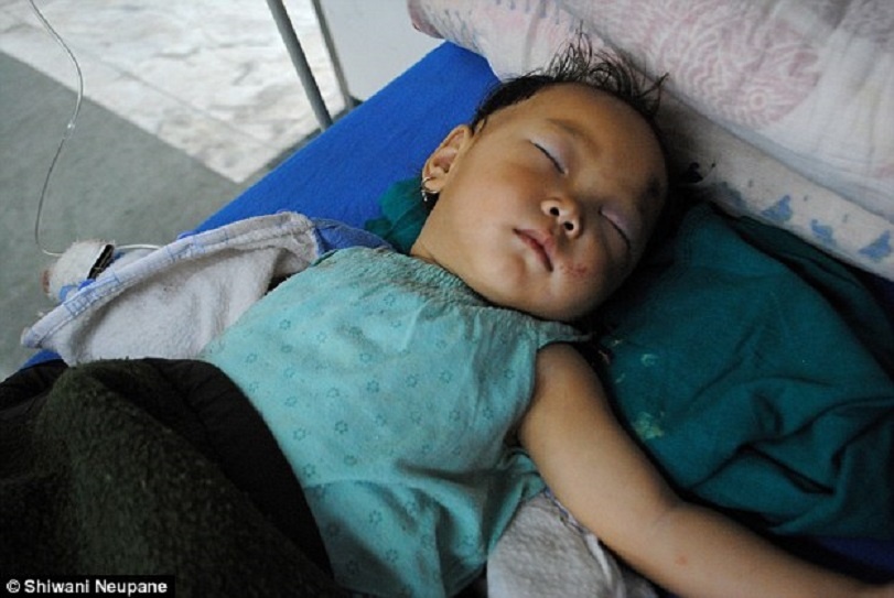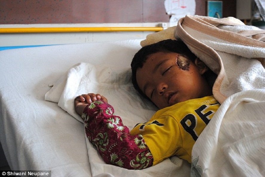| Arush Maharjan, 6 tuổi, ngủ trên giường bệnh. Tại thời điểm động đất xảy ra, Arush đang chơi với bạn trong nhà người hàng xóm. Khi cha của cậu đào cậu lên từ đống đổ nát, Arush bị thương nghiêm trọng ở đầu và vài chỗ khác trên cơ thể. Tuy nhiên, cậu bé 6 tuổi vẫn khá may mắn. Một người bạn của Arush, Raken Maharjan, đã thiệt mạng. "Nó vẫn còn sợ hãi và thường xuyên tỉnh giấc vì gặp ác mộng", Ritu Maharjan, chị gái của bệnh nhân, nói. |