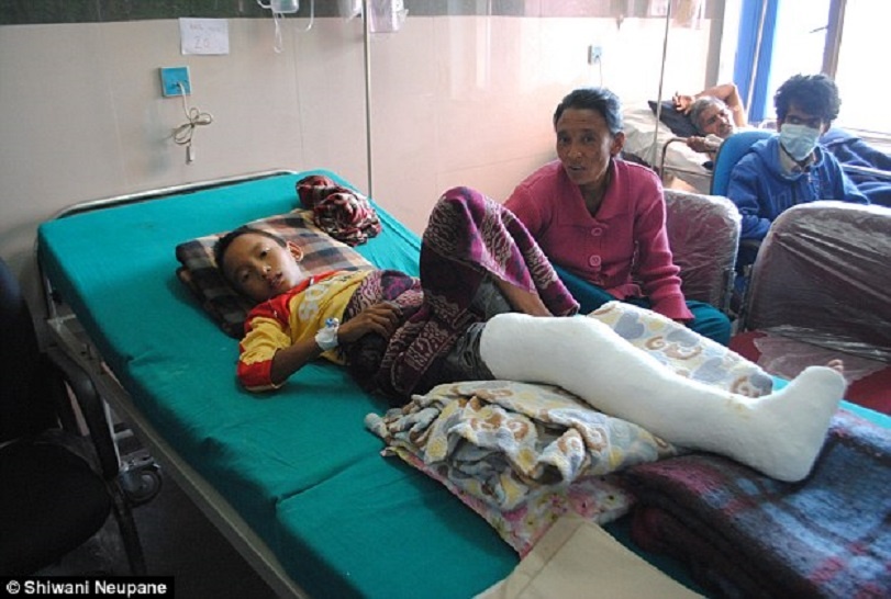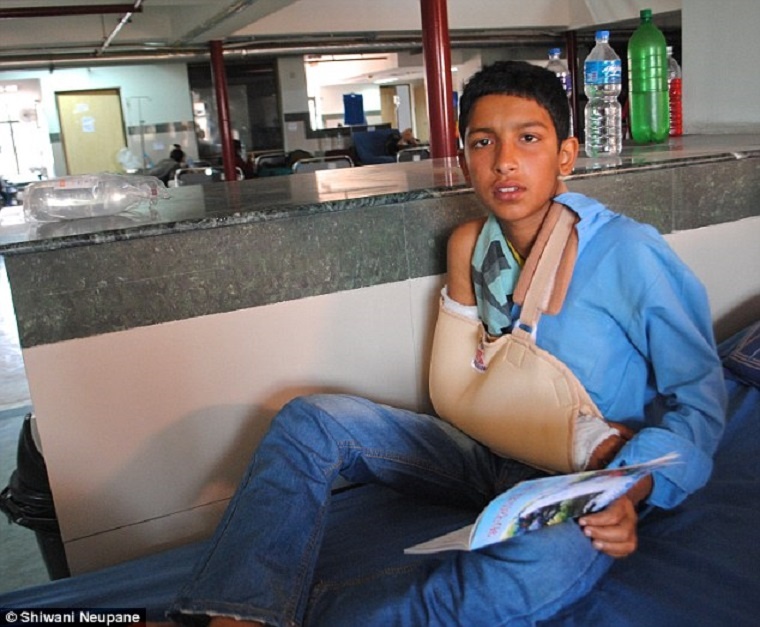 | Dhitak Bomjom, 12 tuổi, gãy chân trong trận động đất. Sau đó, bác sĩ tại bệnh viện địa phương băng bó sơ qua cho cậu. Cơn địa chấn gây lở đất, chặn tất cả tuyến đường nối làng nhỏ ở huyện Sindhupalchok ở miền trung Nepal với thế giới bên ngoài. 3 ngày sau, chính phủ điều động trực thăng tới để giải cứu các nạn nhân. Gia đình đưa Dhitak đến Bệnh viện Bir ở thủ đô Kathmandu. Cha cậu, ông Sano, kể rằng ít nhất 200 người trong làng thiệt mạng. |