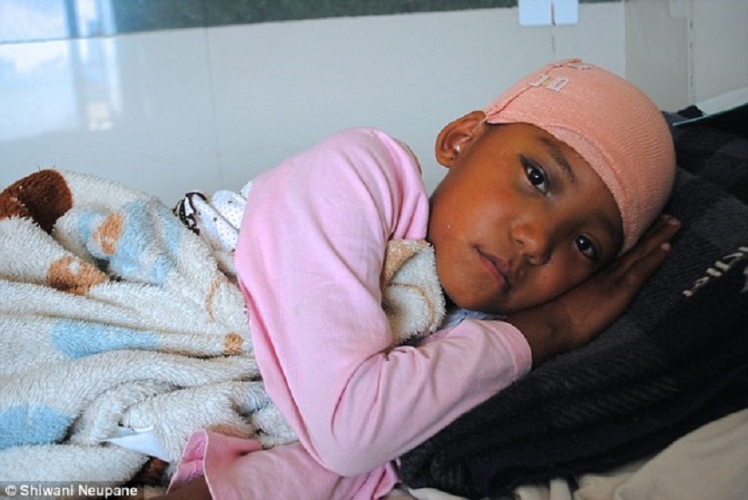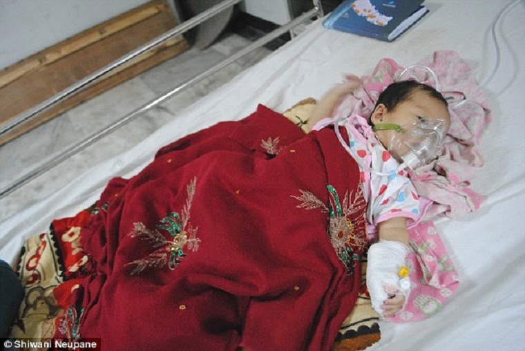 | Mặt nạ dưỡng khí quá lớn so với gương mặt nhỏ nhắn của Radhika Maskey. Mặc dù rất khó chịu, bé gái gần hai tháng tuổi không khóc. Gia đình Maskey sống trong một ngôi nhà có khả năng chống động đất. Trong trận động đất lịch sử hôm 25/4, bé ngã từ giường xuống sàn nhà. Vì Maskey không bị thương bên ngoài nên gia đình không đưa em đến bệnh viện. Sau đó, bé gái hai tháng tuổi bắt đầu biếng ăn, nôn mửa và sốt cao. Nirmala Maskey, mẹ của bé, đưa con gái đến bệnh viện gần nhất. 3 ngày sau, bác sĩ chuyển bệnh nhân đến Bệnh viện Bir. Tình hình của Radhika khá ổn định nhưng bé vẫn cần trải qua phẫu thuật loại bỏ máu đông trong não. |