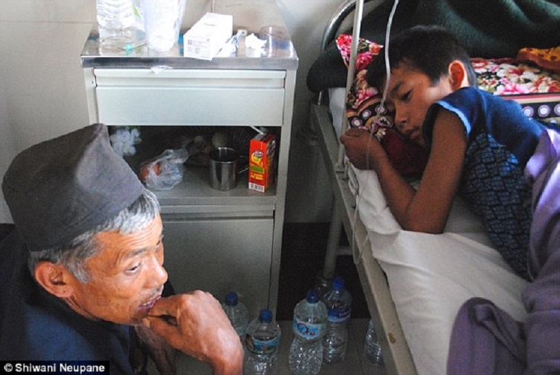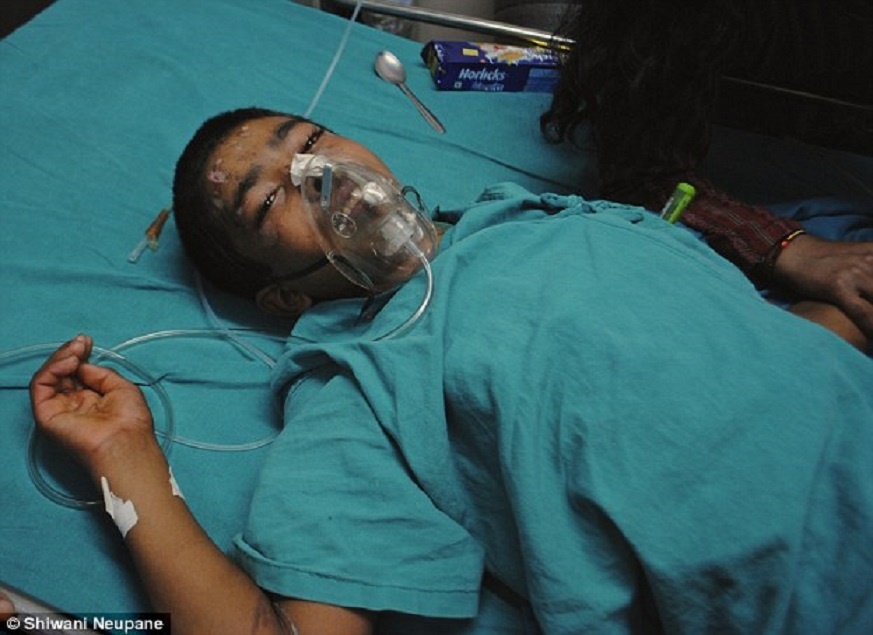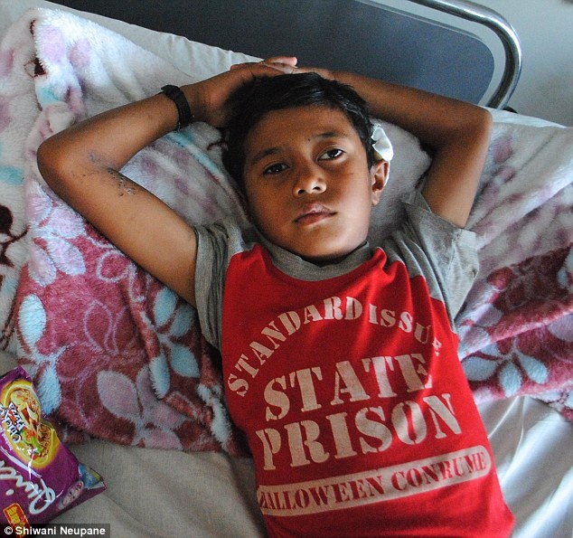 | Trong hai ngày đầu ở bệnh viện, Pradeep Nepal, 13 tuổi, vẫn tỉnh táo. Sau đó, cậu hôn mê. 3 thành viên trong gia đình phải giữ chặt tay chân cậu bé khi cậu la hét và giãy giụa vì đau đớn trong tình trạng bất tỉnh. Giống như những đứa trẻ khác, Pradeep được bố mẹ đào lên từ đống đổ nát của ngôi nhà. "3 ngày trước, thằng bé bắt đầu tiêu chảy và không thể ăn bình thường. Tôi cảm thấy bất lực", mẹ của Pradeep nói. Cậu bé thường xuyên giãy và la hét khiến các bác sĩ không thể chụp cắt lớp để xác định tình trạng của bệnh nhân. |