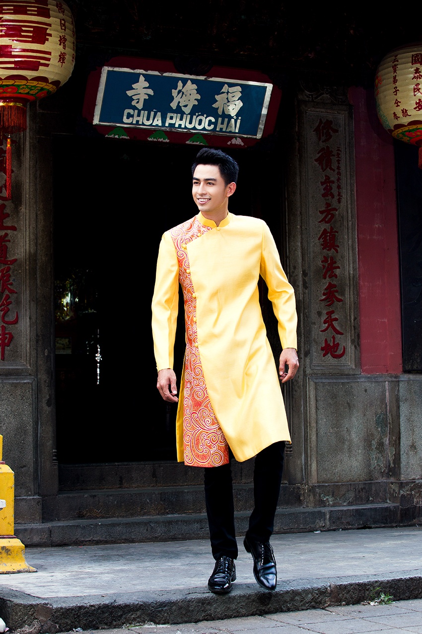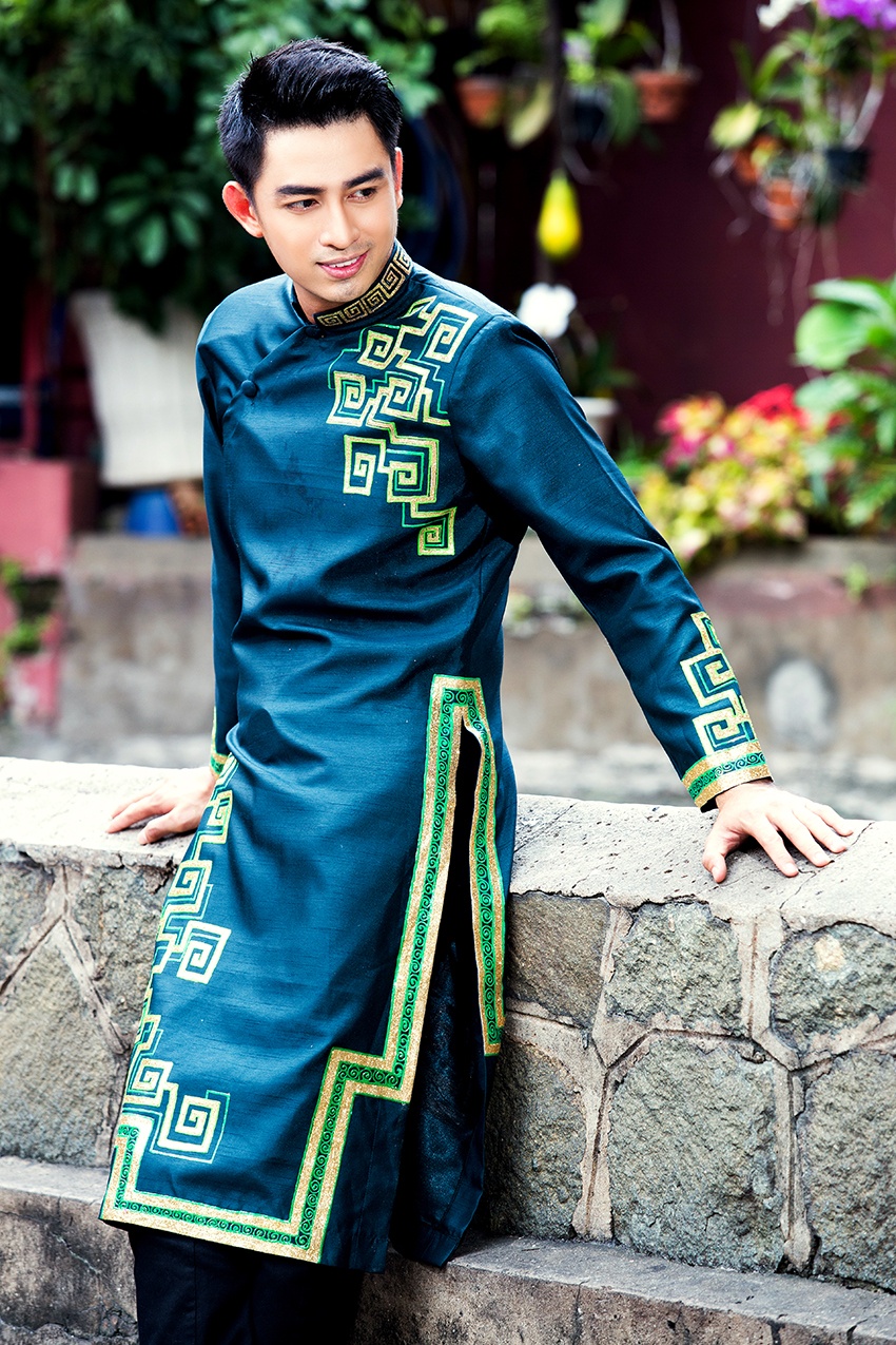 | Vẻ nam tính của các chàng trai được phát huy nhờ phom áo dài cổ điển, màu sắc tươi trẻ, khỏe khoắn. Điểm nhấn họa tiết dân tộc ở thân áo hài hòa. |