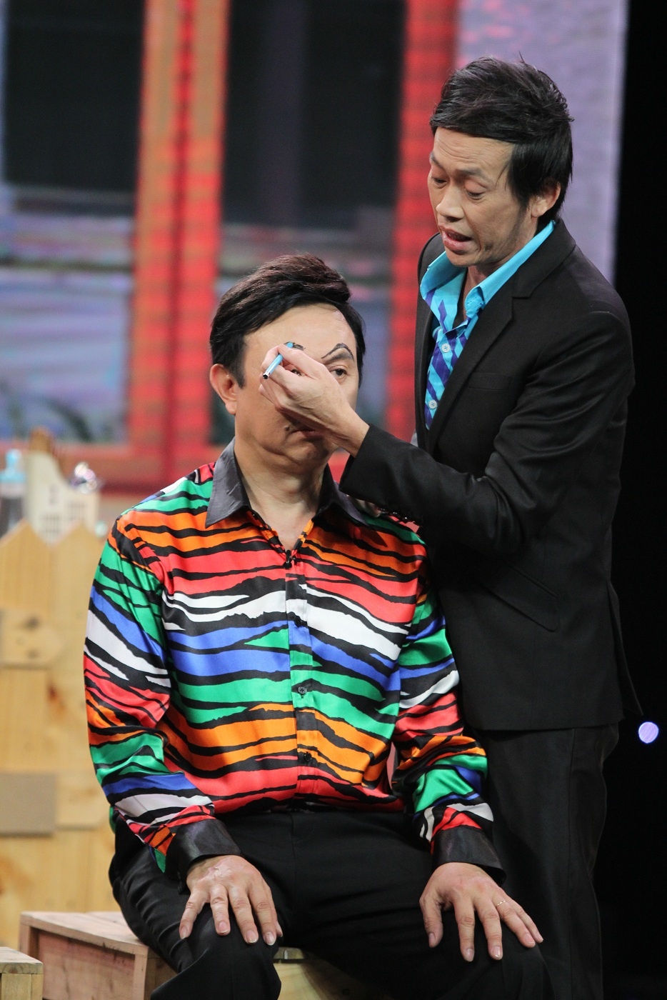 | Hoài Linh xuất hiện kịp thời để “trừng trị” gia đình hội quán. Danh hài bắt đồng nghiệp ngồi yên để anh chỉnh lại chân mày. |