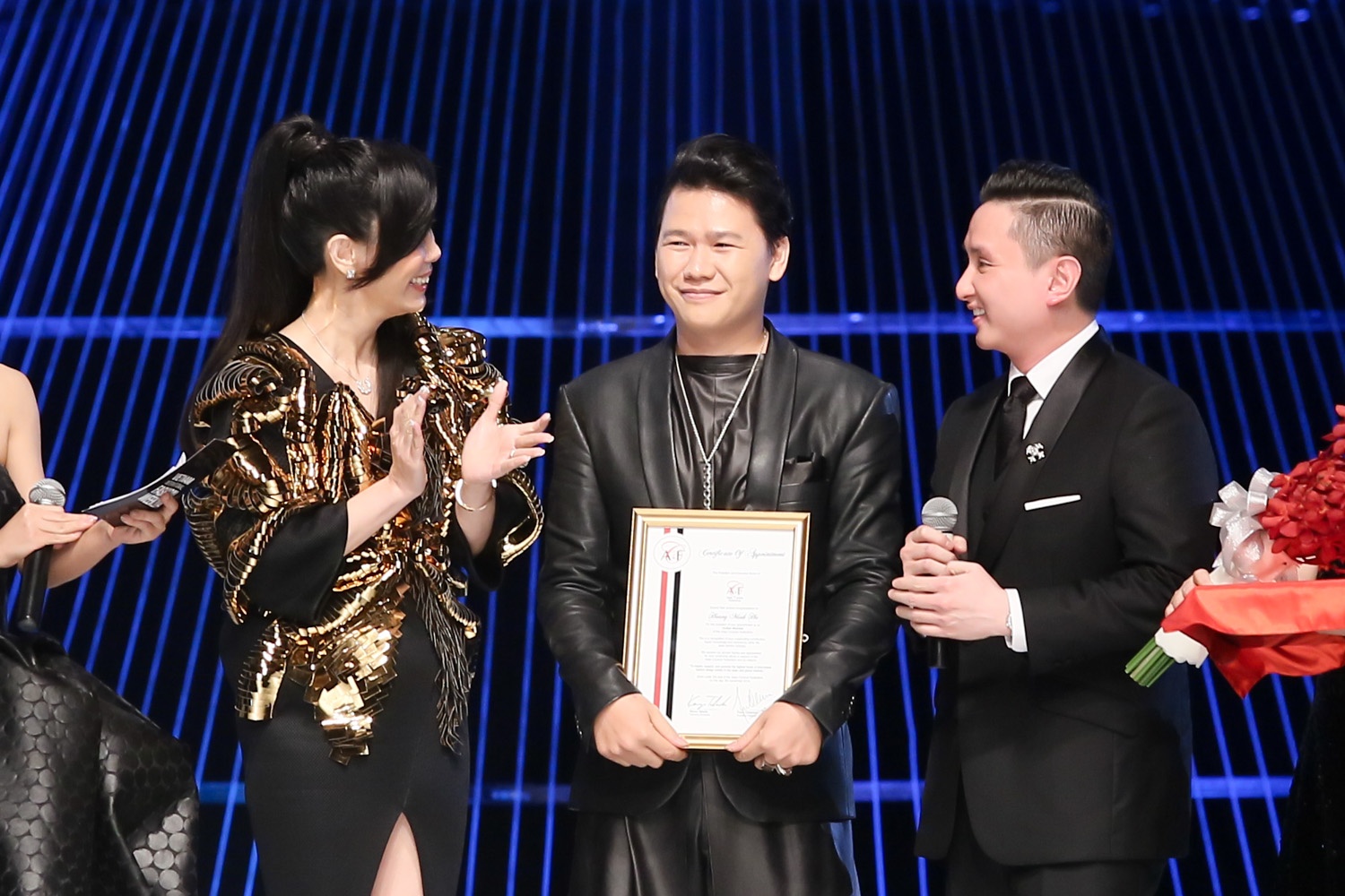 | NTK Hoàng Minh Hà được tiến sĩ Frank và đồng nghiệp của ông Emily công bố và trao bằng chứng nhận trong đêm bế mạc Tuần lễ thời trang quốc tế Việt Nam. |