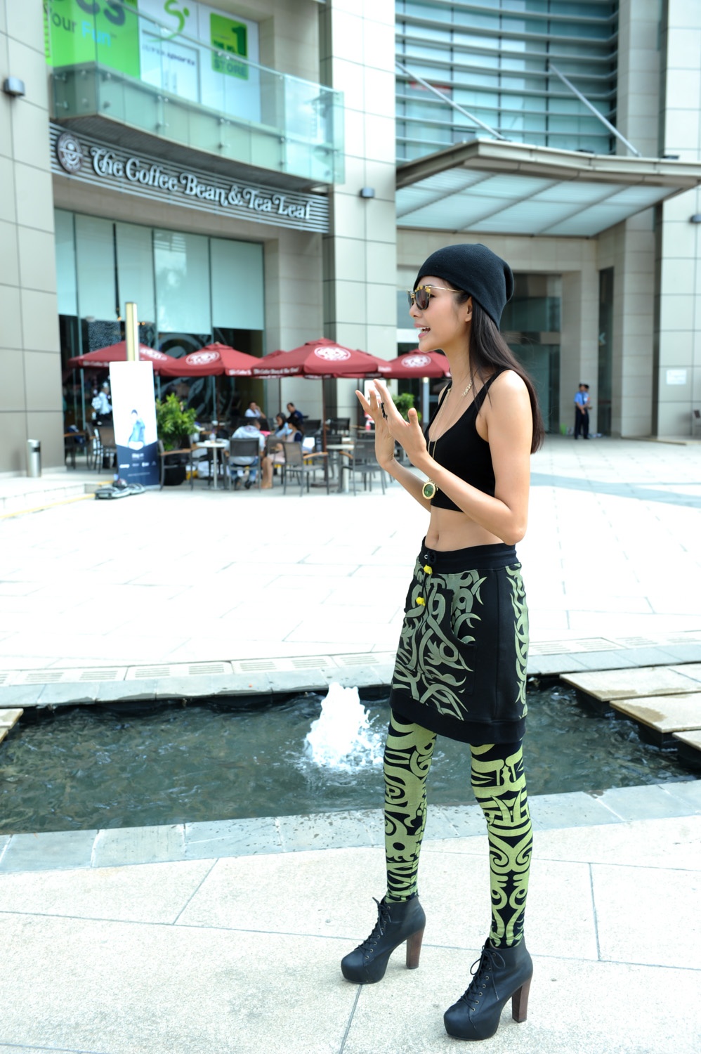 Có mặt tại địa điểm thi từ sớm, Quán quân Vietnam's Next Top Model nổi bật trong bộ trang phục bụi phủi, khỏe khoắn. Áo tan-top giúp cô khoe khéo vòng eo thon gọn, đi kèm là quần váy họa tiết bắt mắt. Điểm nhấn phụ kiện hòa hợp cùng tổng thể.