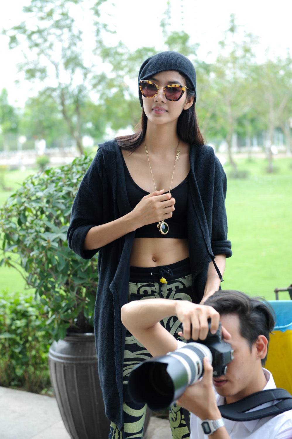 Hoàng Thùy không quản trời trưa nắng để hướng dẫn từng thí sinh cách ngồi phù hợp, làm toát lên những điểm nhấn cuốn hút của trang phục.