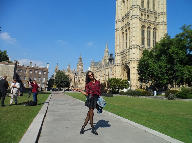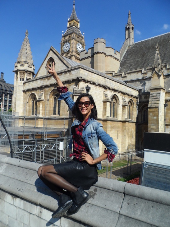 | Hoàng Thùy tươi tắn khi đặt chân đến London. Dù trước đó, cô phải trải qua hơn chục giờ bay từ TP.HCM sang xứ sở sương mù. |