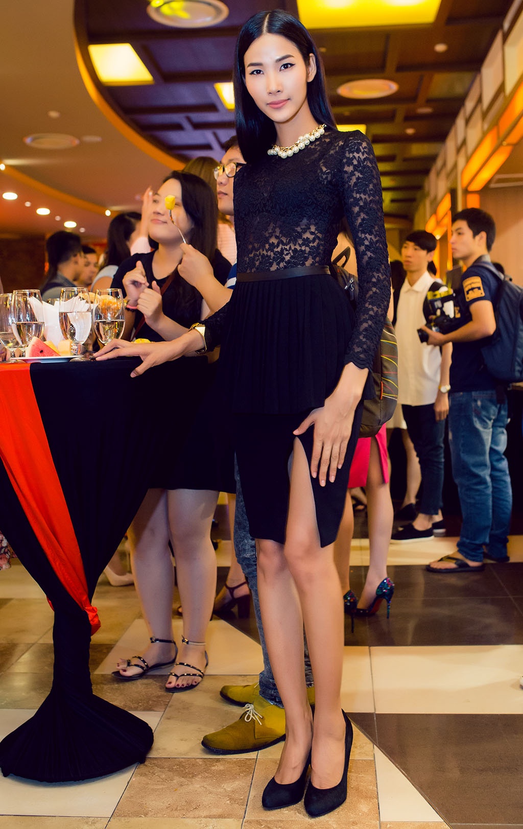 | Tối 15/10, Hoàng Thuỳ đã có mặt trong buổi họp báo ra mắt phim Gái hư (Call Me Bad Girl) tại rạp Lotte, TP.HCM. Quán quân Vietnam’s Next Top Model mùa đầu thu hút sự chú ý bởi trang phục áo ren xuyên thấu kết hợp với váy xẻ tà khoe được những đường cong gợi cảm. |
