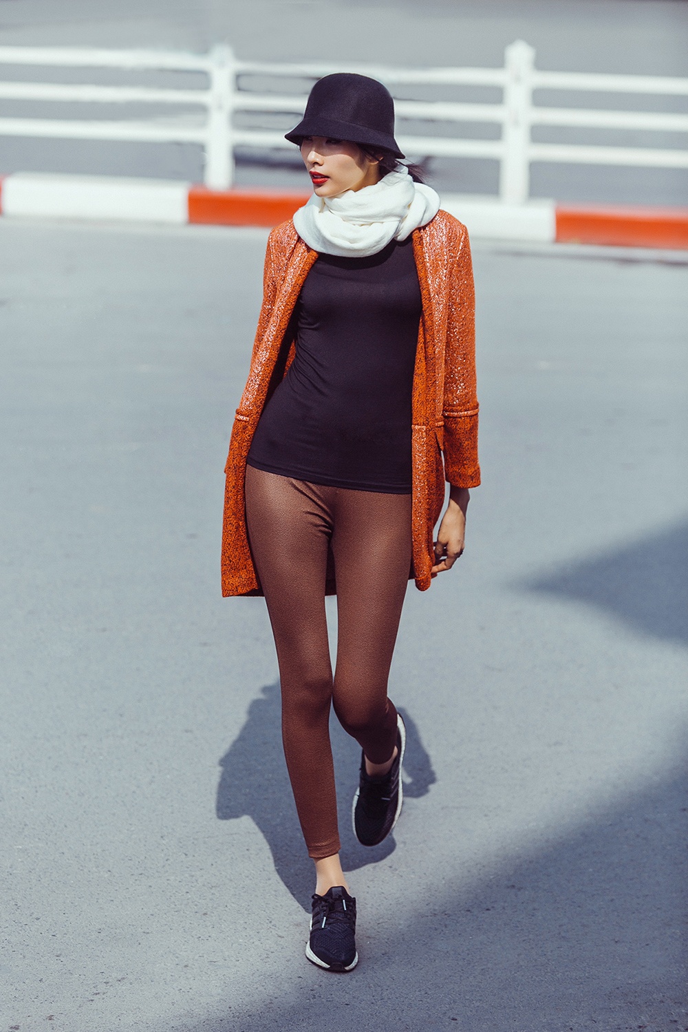 | Cùng với tiêu chí dùng gam trầm nhưng bộ cánh tiếp theo được phối đồng điệu giữa gam nâu. Phụ kiện khăn quàng cổ trắng làm điểm nhấn. Cô đi giày bata để thoải mái khi xuống phố. |