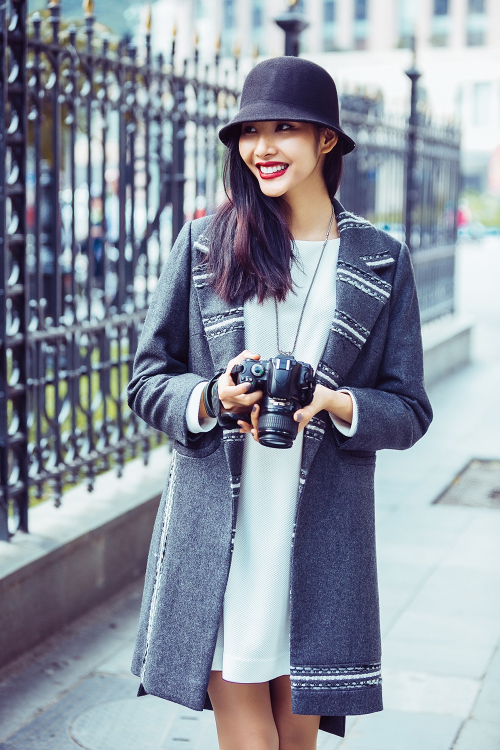 | Sở hữu vóc dáng thanh mảnh, Hoàng Thùy dễ dàng ứng dụng nhiều phong cách từ nữ tính đến hiện đại. Trong ảnh, người đẹp 9X diện váy ôm trắng, áo măng tô xám. Phụ kiện tối màu tiệp tổng thể. |