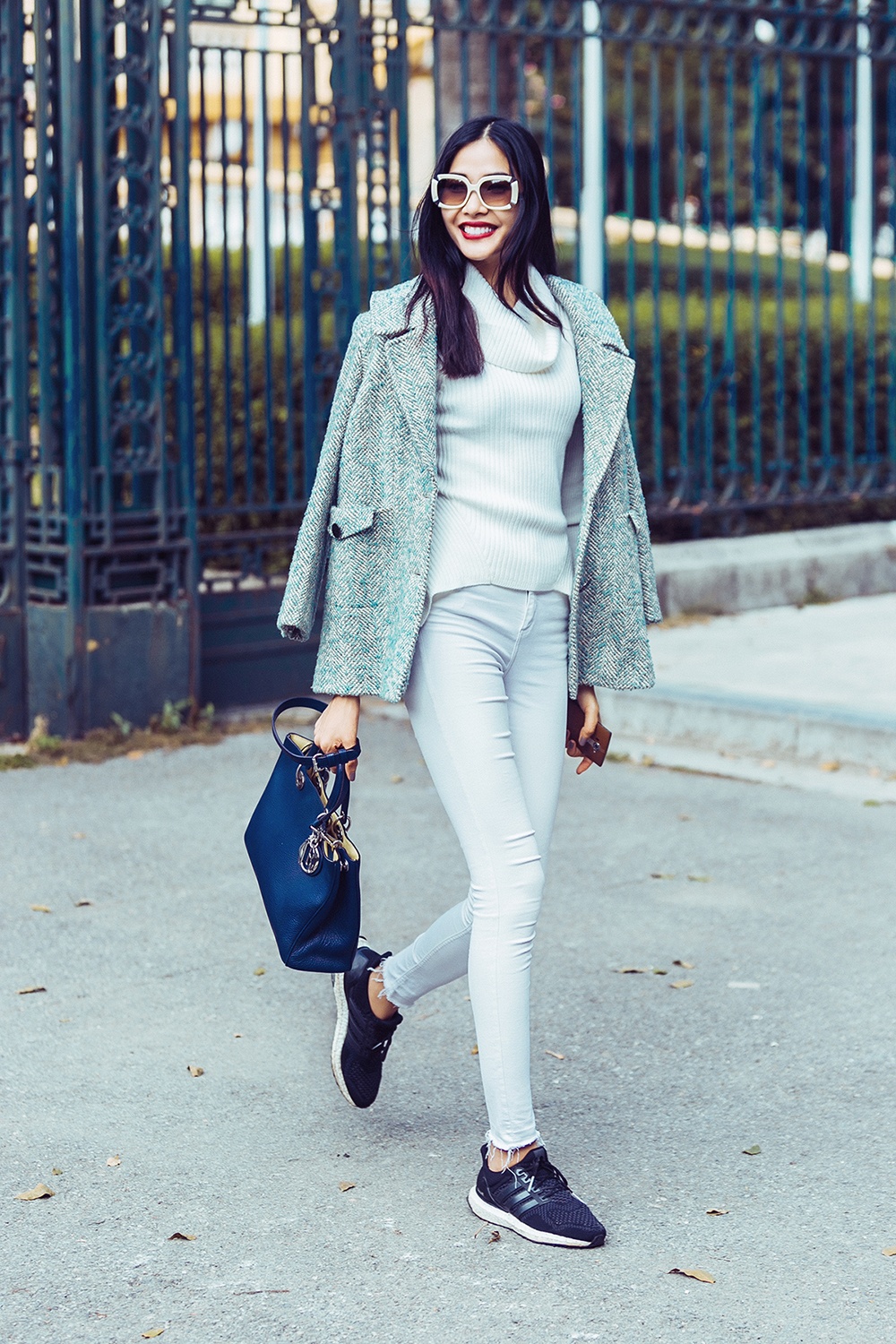 | Set trang phục cây trắng được người mẫu mix - match hòa hợp với vest dạ. Phụ kiện giày bata năng động và thoải mái. |