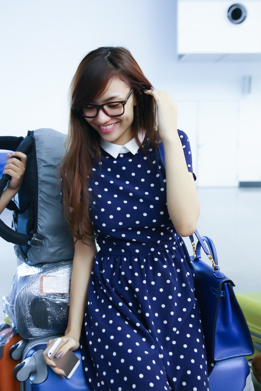 | Khác với chân dài đàn chị, Hồng Quế lại chọn phong cách nữ tính cùng váy chấm bi khi tới sân bay. Cô khéo léo chọn chiếc túi ton-sur-ton với màu váy trong chuyến sang châu Âu lần này. |