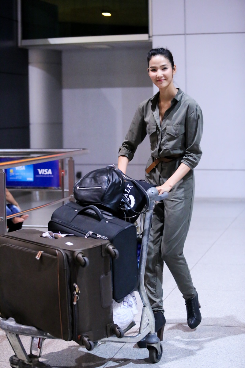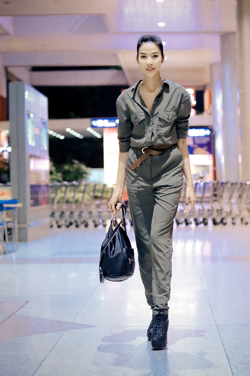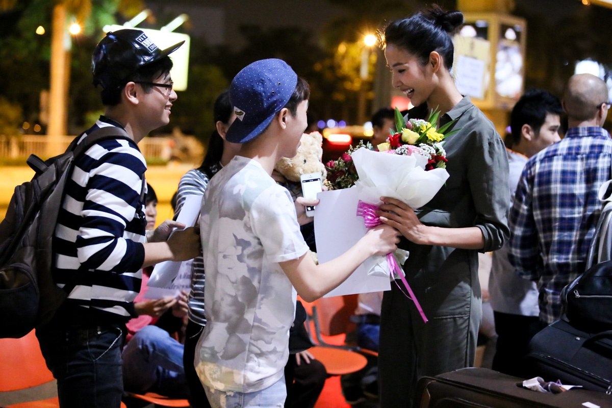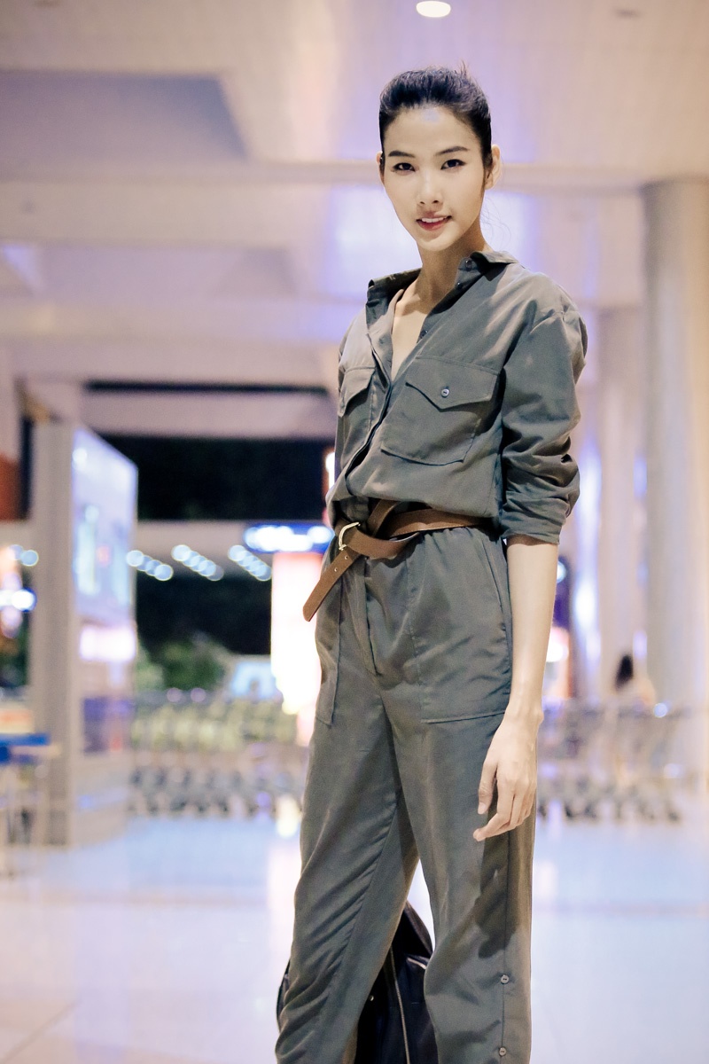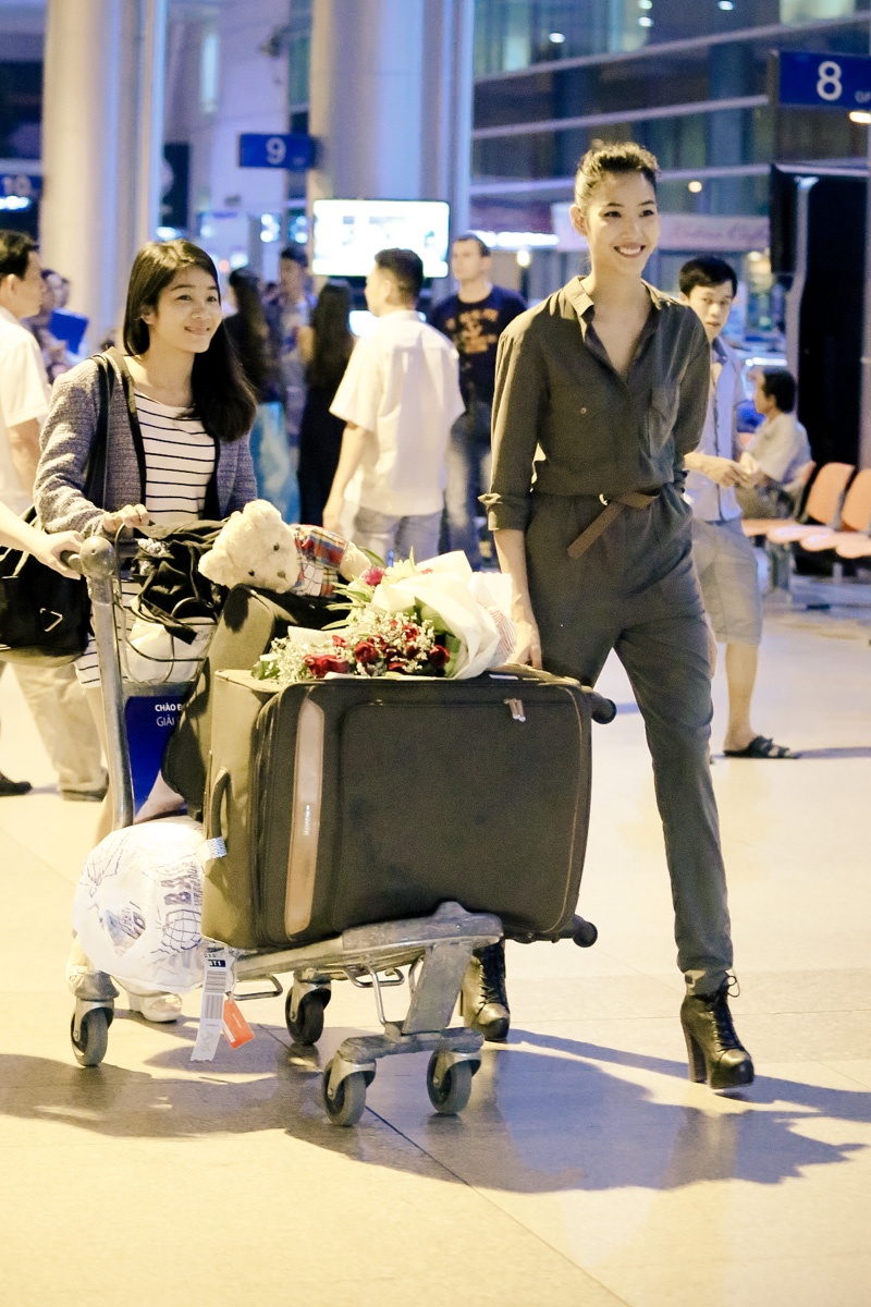 | Vào tối qua 26/9, Hoàng Thùy đáp chuyến bay từ Anh trở về TP.HCM sau một tháng sang London tham gia Tuần lễ thời trang xuân hè 2015. Nữ người mẫu trông rạng rỡ và cá tính trong bộ trang phục phong cách quân đội cá tính. |