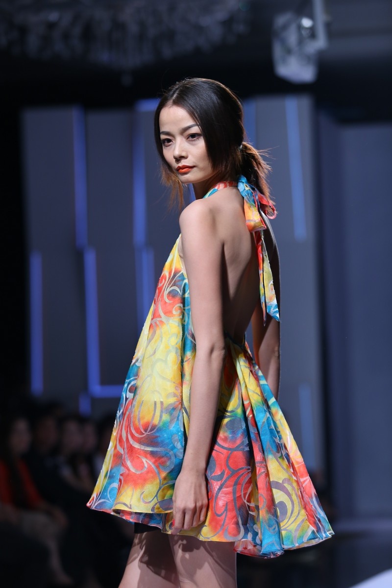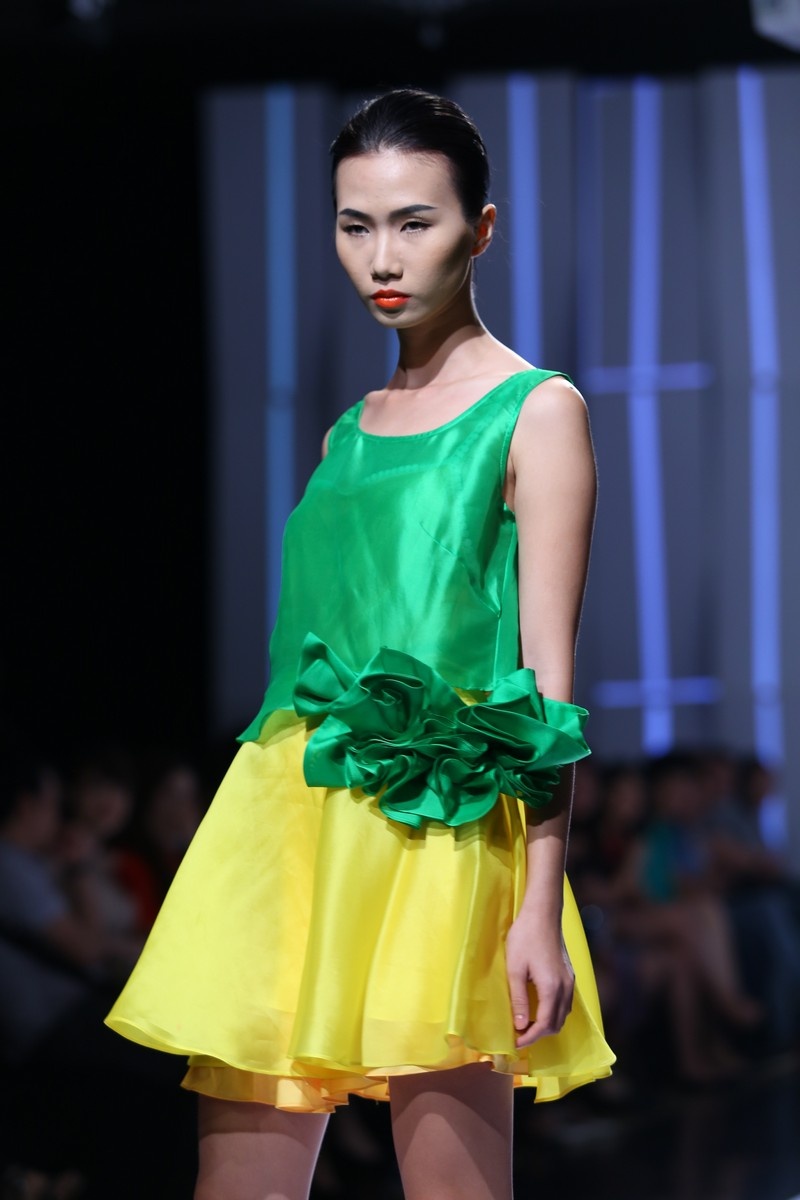 Người mẫu Thùy Linh trình diễn một thiết kế tươi tắn và không kém phần nổi bật.